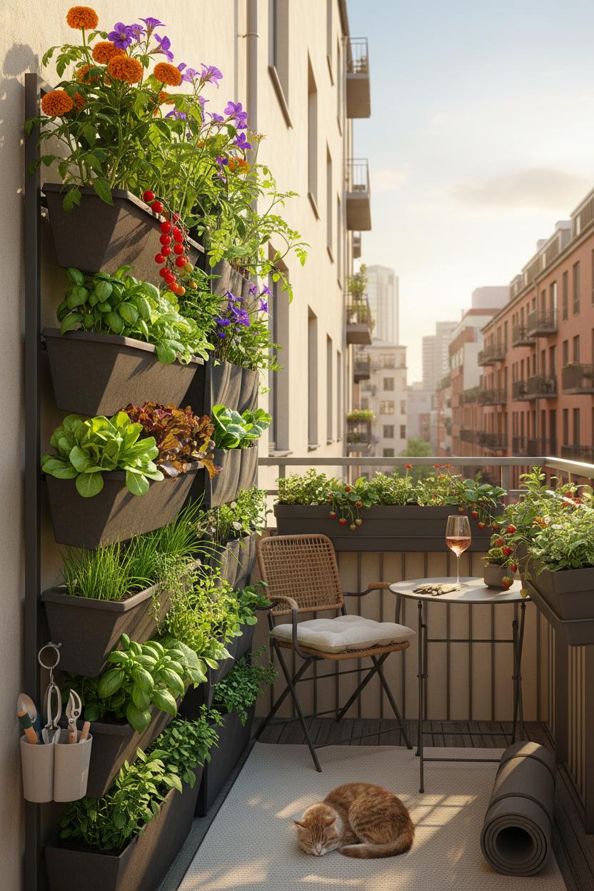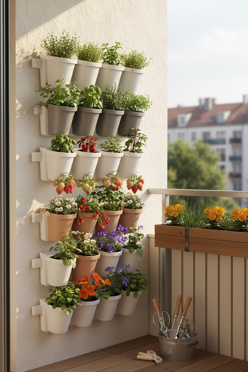 When space is scarce, think up, not out. Vertical planters turn your walls, railings, and corners into living tapestries, freeing the floor for a bistro chair, a cat nap, or your morning yoga mat. Instead of cramming pots shoulder to shoulder, you layer small balcony plants at eye level where they soak up light and show off their textures—ruffled lettuces next to glossy basil, trailing thyme spilling below a pop of marigolds. It’s one of those balcony garden ideas that feels like a magic trick: more green without more square footage. A slim vertical planter tucked against the wall doubles as a privacy screen and softens hard lines; a simple railing planter frames the view with herbs and strawberries. For apartment gardening, this setup also creates microclimates—sun-lovers on top, shade-tolerant plants below—so each leaf gets its perfect spot. Add self-watering pots into the mix to keep moisture steady across tiers, and maintenance becomes as breezy as your evening glass of rosé.