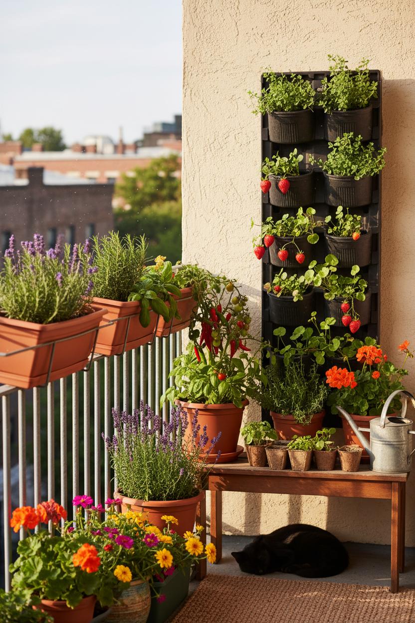 Choosing the right small balcony plants starts with reading your light and wind. If your railings soak in afternoon sun, lean into heat-loving herbs and compact edibles that thrive in containers: rosemary, thyme, and lavender bring that Mediterranean scent and shrug off bright rays, while cherry tomatoes, chili peppers, and bush basil keep an herb garden balcony within arm’s reach of your kitchen. Geraniums, portulaca, and dwarf zinnias add nonstop color without fuss. Tuck them into self-watering pots so roots stay evenly moist between heat waves, and try a vertical planter to stack strawberries, oregano, and trailing nasturtiums up the wall—one of the simplest balcony garden ideas for squeezing a lot of flavor into a tiny footprint. If you’re brand new to apartment gardening, an herb starter kit is an easy on-ramp; start seeds indoors, then graduate the strongest seedlings into your vertical planters when nights warm up.