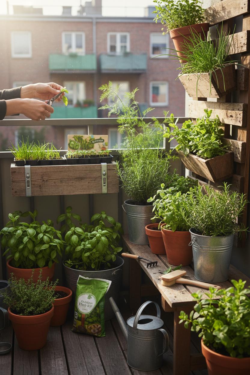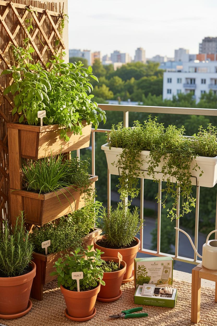 Upcycling is where your balcony garden ideas really bloom. A sanded pallet lined with landscape fabric turns into a pocket-style vertical planter—tuck in basil, parsley, and trailing strawberries for a layered edible wall. Metal gutters become a sleek railing planter when capped at the ends and drilled for drainage; stagger two rows for a cascading herb tier. Tin cans, painted in sun-washed pastels, make adorable mini planters—clip them to a wire grid with binder clips and plant chives, dill, and oregano. An over-the-door shoe organizer also morphs into a space-saving herb library when you punch a few drainage holes and slip in potting mix. If you’re starting from scratch, a compact herb starter kit is a low-stress way to fill those pockets, and self-watering pots keep weekend getaways worry-free. Finish with a sturdy vertical planter or two for anchor pieces, then grab your balcony garden tools—hand trowel, snips, and a small watering can—to keep everything tidy. With a little creativity, these upcycled layers turn even the tiniest ledge into a lush, productive herb garden balcony that feels curated, cozy, and totally you.