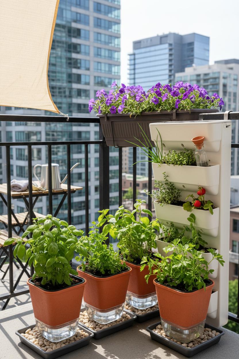 Of all the balcony garden ideas, the smartest upgrade might be self-watering pots paired with generous drainage trays. Balconies are windy, sunbaked, and prone to splashy runoff—great for city views, less great for basil. Self-watering pots tuck a hidden reservoir under your soil so water wicks up as roots need it, keeping small balcony plants consistently hydrated and saving you from daily watering chores. They’re a dream for an herb garden balcony—think basil, mint, and chives from a simple herb starter kit that stays lush without the daily wilt-and-revive routine. If you’re using vertical planters, look for models that accept water at the top and trickle it down through each pocket; a compact vertical planter with built-in reservoirs makes apartment gardening feel wonderfully low-maintenance. Just slide a sturdy drainage tray or slim saucer beneath each pot or module to catch extra drips and protect floors, especially if your neighbor’s café table is right below.