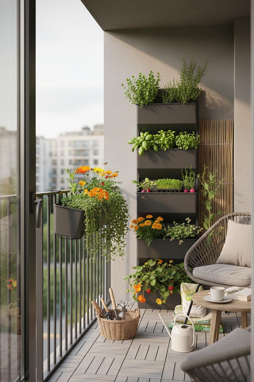 Vertical planting shines on a herb garden balcony because you can harvest at arm’s reach. Start with a cheerful herb starter kit to fill your first tier—basil, mint, chives, and parsley—then layer in edible flowers or compact tomatoes above for a lush, edible wall. The vertical layout makes snipping, deadheading, and replanting fast, especially with a few trusty balcony garden tools stashed in a caddy. Bonus: airflow between tiers helps leaves dry quickly after watering, which keeps mildew at bay in tight urban nooks. And if you’re short on sun, the staggered levels reduce shadowing so even the lower plants get their glow. Whether you prefer a sleek tower, a ladder-style frame, or a grid of hanging pockets, vertical planters let you curate little color stories and textures without clutter. The result is a tiny sanctuary that feels intentional and abundant—proof that small balcony plants, arranged thoughtfully, can create a lush escape high above the street.