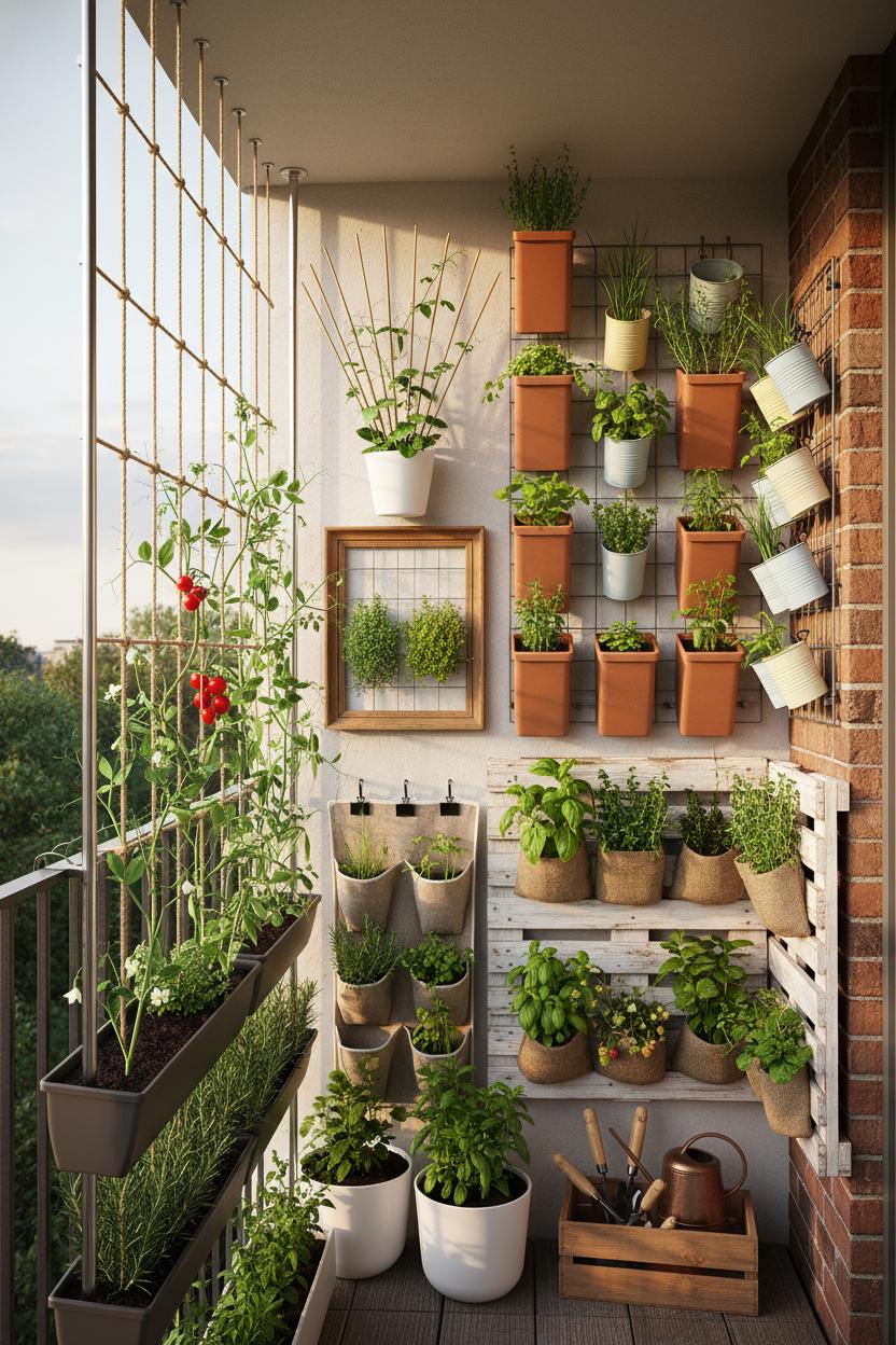If you’re craving height and texture without sacrificing precious floor space, start with an easy trellis hack. Tension rods wedged between ceiling and railing, laced with jute twine, make a light, airy ladder for peas, cherry tomatoes, and trailing jasmine—perfect small balcony plants that climb instead of sprawl. You can also zip-tie bamboo stakes into a slim fan and pop the base into a self-watering pot so the vines sip steadily while they rise. For an artsy twist, stretch garden wire across an old picture frame and hang it with S-hooks; it becomes a living mosaic once thyme, mint, and dwarf cucumbers begin to weave through. These compact structures double as a privacy screen and instantly elevate your apartment gardening vibe, especially when paired with narrow vertical planters along the wall. Think of it as jewelry for your herb garden balcony: glints of green, a little structure, and lots of charm.