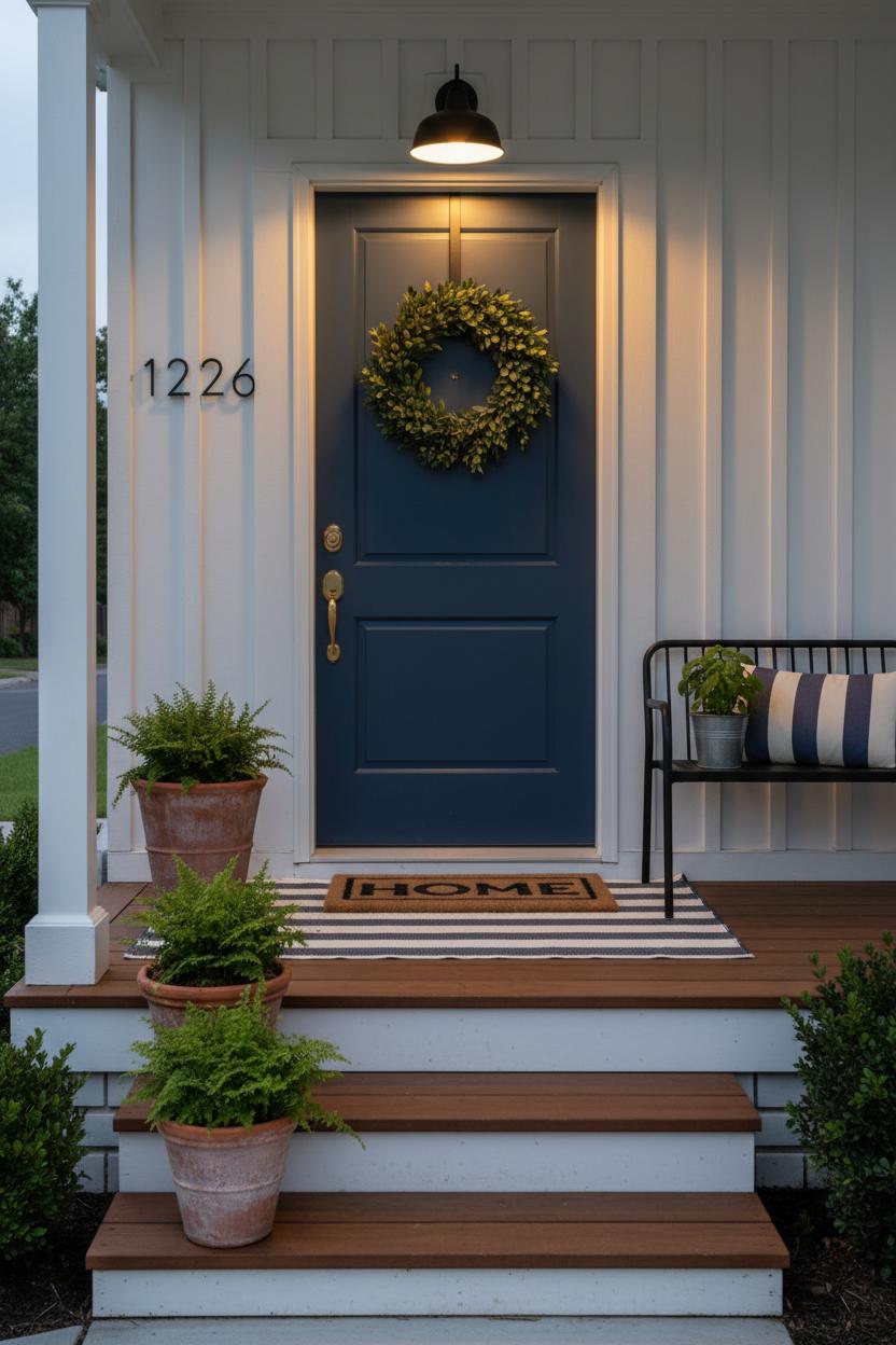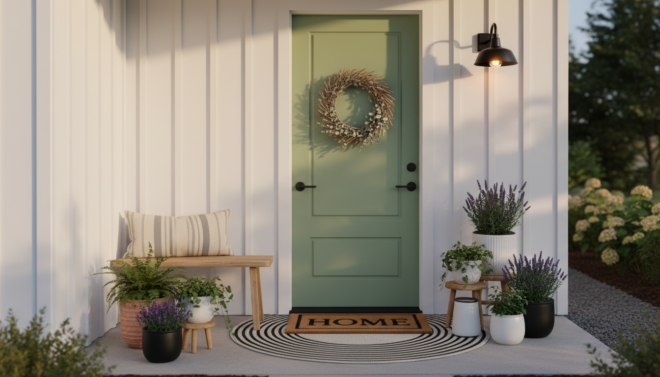 Think vertically and seasonally to stretch impact. A narrow wall hook rail can hold a lantern, umbrella, or a mini hanging basket, while a petite stool or crate works as a side table for a coffee mug or package drop. If you’re eyeing a quick porch makeover, swap textiles and wreath ribbons with the seasons and rotate flowering porch planters for fresh pops of color—no big renovations required. Keep accessories edited so sightlines stay open, and let the details do the heavy lifting: polished house numbers, a handsome doorbell button, and a crisp, freshly painted door. With just a few layered choices—bench, planters, lighting, mat, and greenery—you’ll turn a pass-through stoop into a cozy, stylish welcome that feels custom and elevates your home’s curb appeal every single day.