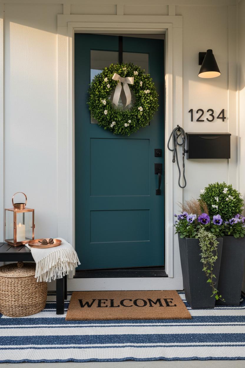 Style with a simple color story and repeat materials for harmony. If your door is bold, let the textiles whisper; if the door is neutral, bring personality with a striped rug, gingham pillow, or copper‑toned planters. Group decor in odd numbers (a trio of porch planters, two lanterns plus a wreath) to create rhythm, and vary heights to guide the eye upward. Add life: a trailing ivy, a compact fern, or dried stems in cooler months keep your outdoor entryway feeling fresh. Finish with a small tray for keys or sunglasses and a tidy hook behind the door for a dog leash—useful, hidden, photogenic. With these layered touches, even the tiniest stoop becomes scroll‑stopping, season after season.