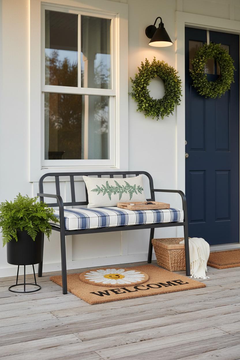 Styling seals the charm and boosts curb appeal. Layer a patterned cushion and one petite lumbar pillow for comfort, then echo the palette at your feet with a layered doormat—think natural coir topped with a seasonal print. Flank the bench with porch planters to anchor the vignette; tall grasses or compact evergreens add height without hogging floor space. Up top, a faux boxwood wreath on the door brings a fresh pop of green year‑round, while an LED wall sconce casts a warm, evening glow that makes even a quick mail run feel special. Keep accessories edited: a small tray for keys, a lidded basket for gloves, maybe a folded throw for crisp mornings. With these small porch decor moves, your simple seat becomes the heart of a mini porch makeover—somewhere to tie shoes, sip coffee, or chat with a neighbor. Most of all, it feels intentional, like your home is saying hello before the door even opens, which is exactly what a thoughtfully designed outdoor entryway should do.