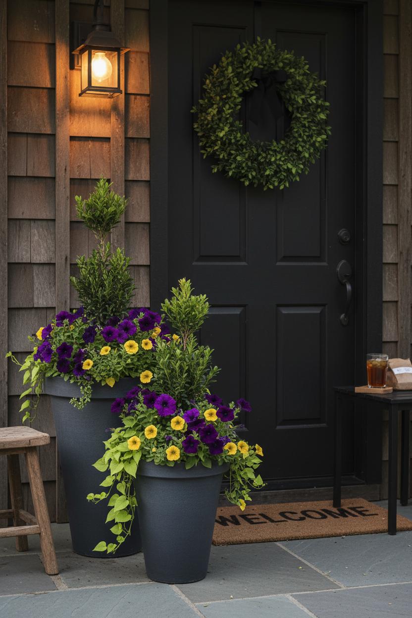 Nothing transforms a small stoop faster than fresh foliage, and the right porch planters can make even the tiniest threshold feel like a curated garden moment. Start by figuring out your light: if your outdoor entryway basks in full afternoon sun, lean into heat-loving combos like petunias, calibrachoa, lantana, and trailing sweet potato vine, with an upright rosemary or dwarf boxwood as the anchor. For shade or dappled light, lush textures are your friend—think ferns, hostas, heuchera, begonias, and impatiens spilling softly over the edges. A pair of tall, tapered planters flanking the door creates instant curb appeal and frames a welcoming view; add a faux boxwood wreath for a little evergreen polish that looks good year-round, even when the blooms take a break. This is one of those small front porch ideas that reads “porch makeover” without a full weekend of work.