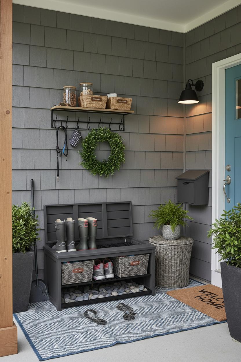 If your outdoor entryway doubles as a family drop zone, lean into smart storage that quietly does the heavy lifting. Start with an outdoor bench that tucks against the wall and hides shoe chaos inside; a lift-top or cubby style keeps sneakers and rain boots out of sight while offering a comfy perch for lacing up. Slide a slim boot tray beneath, filled with river stones for drainage, so wet soles don’t track inside. Add a couple of woven baskets under the bench for pet wipes and tennis balls, and mount a narrow rail of hooks just above for leashes, umbrellas, and that always-missing poop bag dispenser. A faux boxwood wreath hung over the hook rail softens the utilitarian moment and sets a friendly tone the second you step onto the porch.