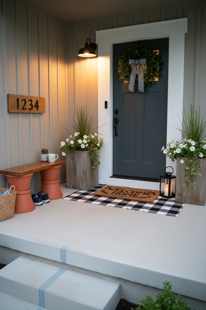 Think of your outdoor entryway as the opening line to your home’s story, and let a layered doormat do the charming introduction. Start with a thin, weather-friendly rug (stripes, buffalo checks, or a subtle geometric) and top it with a classic coir or rubber doormat—instant dimension and personality without eating up precious square footage. It’s one of the easiest small front porch ideas because it sets a color palette you can echo elsewhere: coordinate the base rug with your front door paint, a pair of porch planters brimming with seasonal greens, or a faux boxwood wreath that says “welcome” with minimal fuss. In tight spaces, pattern is your friend; a lengthwise stripe can visually stretch a narrow stoop, while a soft check warms up concrete in a second. If evening visitors are common, a sleek LED wall sconce overhead casts a warm glow that makes those layers pop, turning practical small porch decor into a cozy moment. Bonus: the whole setup is an affordable mini porch makeover you can pull off in an hour—no power tools, just taste and texture.