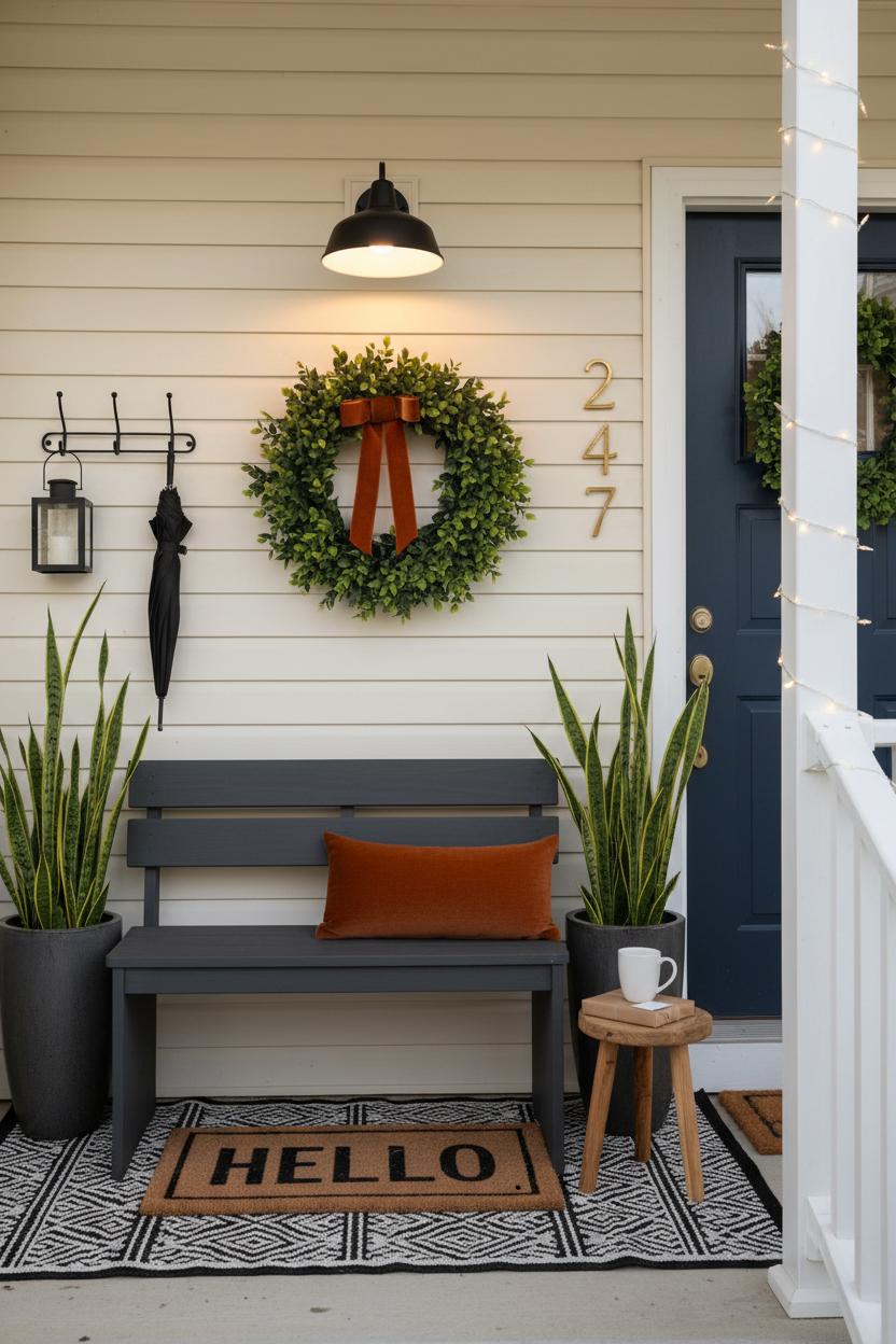 Symmetry is your shortcut to instant curb appeal, especially on tight footprints. Double up where you can: a pair of porch planters with matching greenery, twin LED wall sconces, or two lanterns staggered to one side if your door is off-center. Even a single focal wreath looks more intentional when it’s perfectly centered; try a faux boxwood wreath for year-round polish that won’t wilt between seasons. If the door swings wide, slide the outdoor bench to the hinge side to visually “anchor” the entry and keep the traffic path clear. These small front porch ideas create calm, repeatable lines that make a tiny space feel deliberate and welcoming.