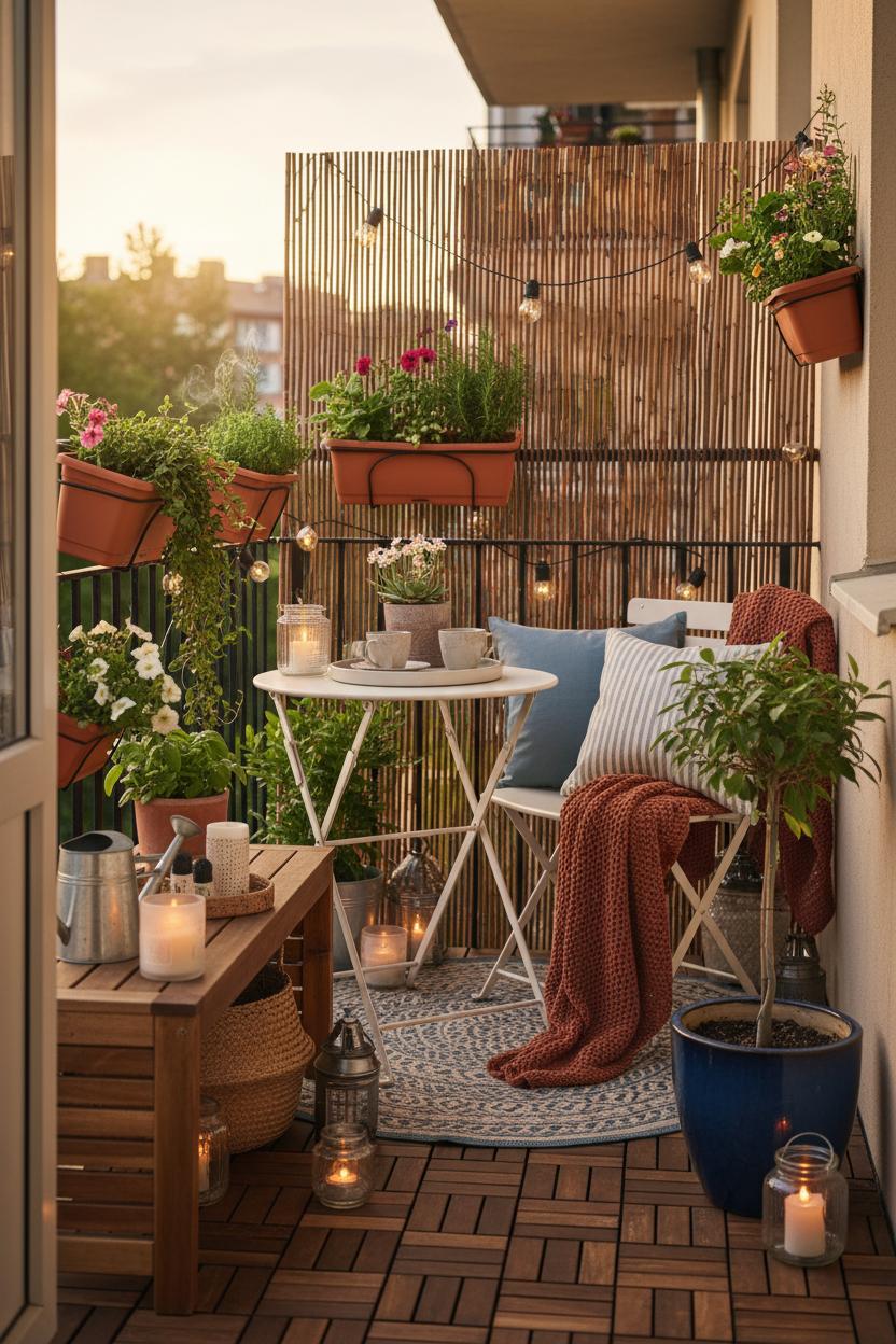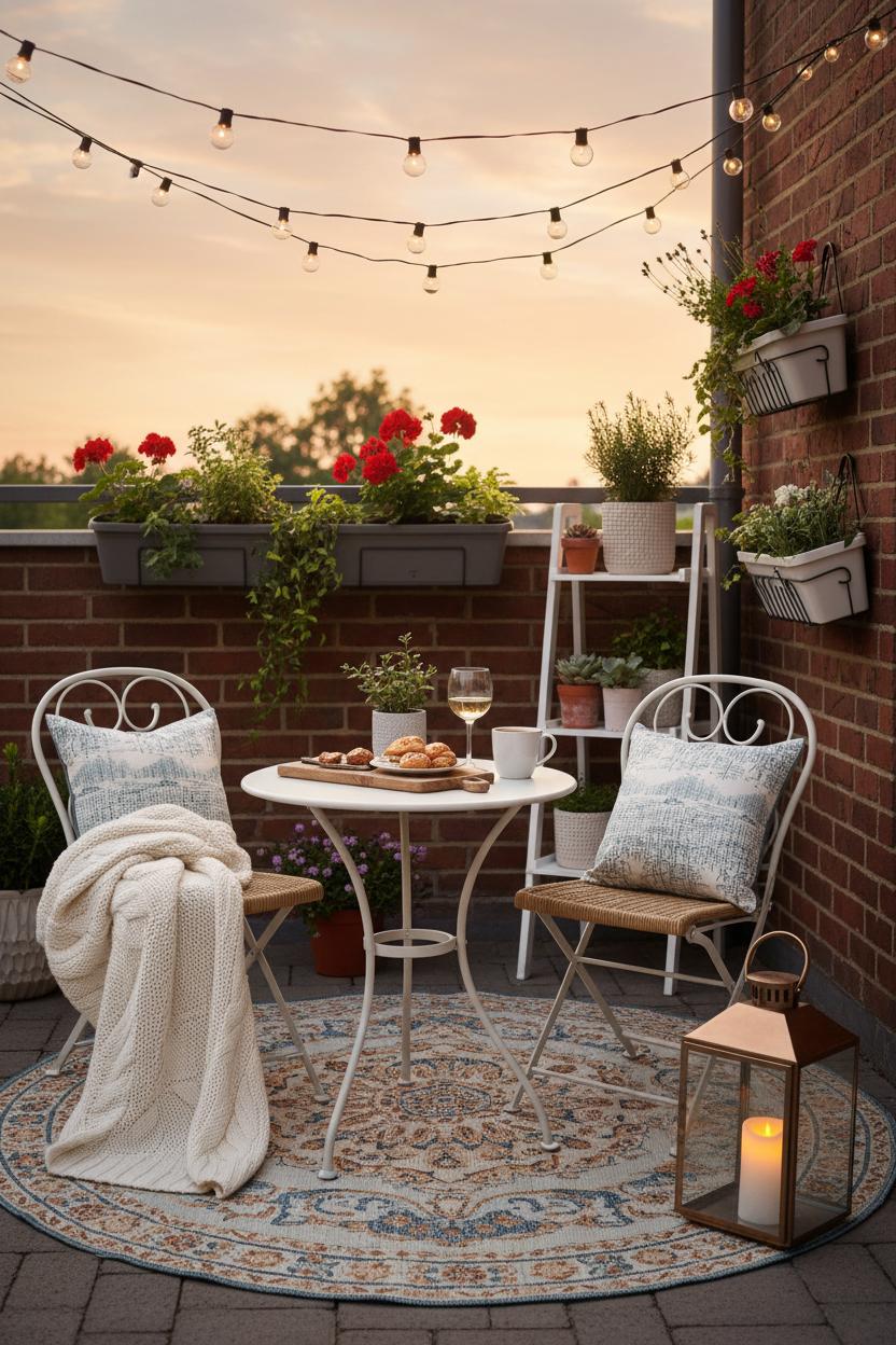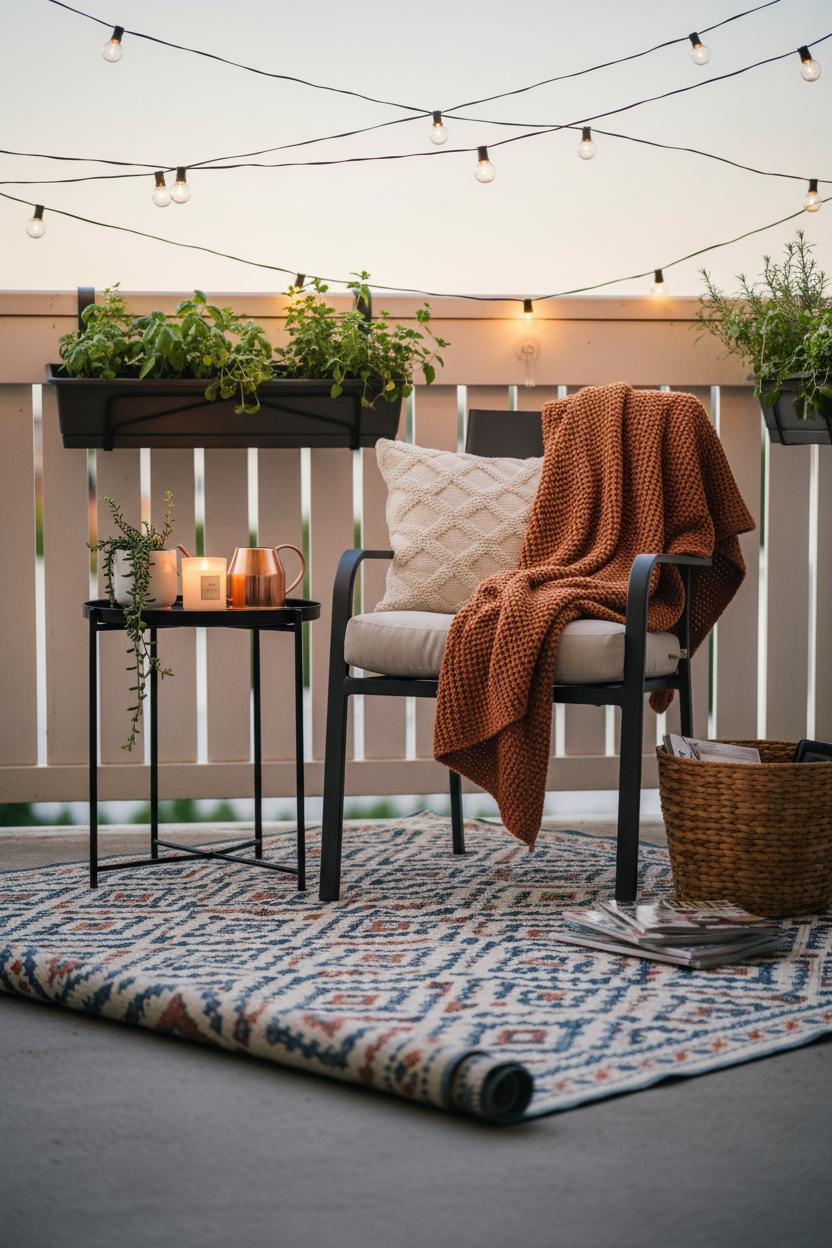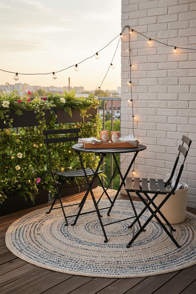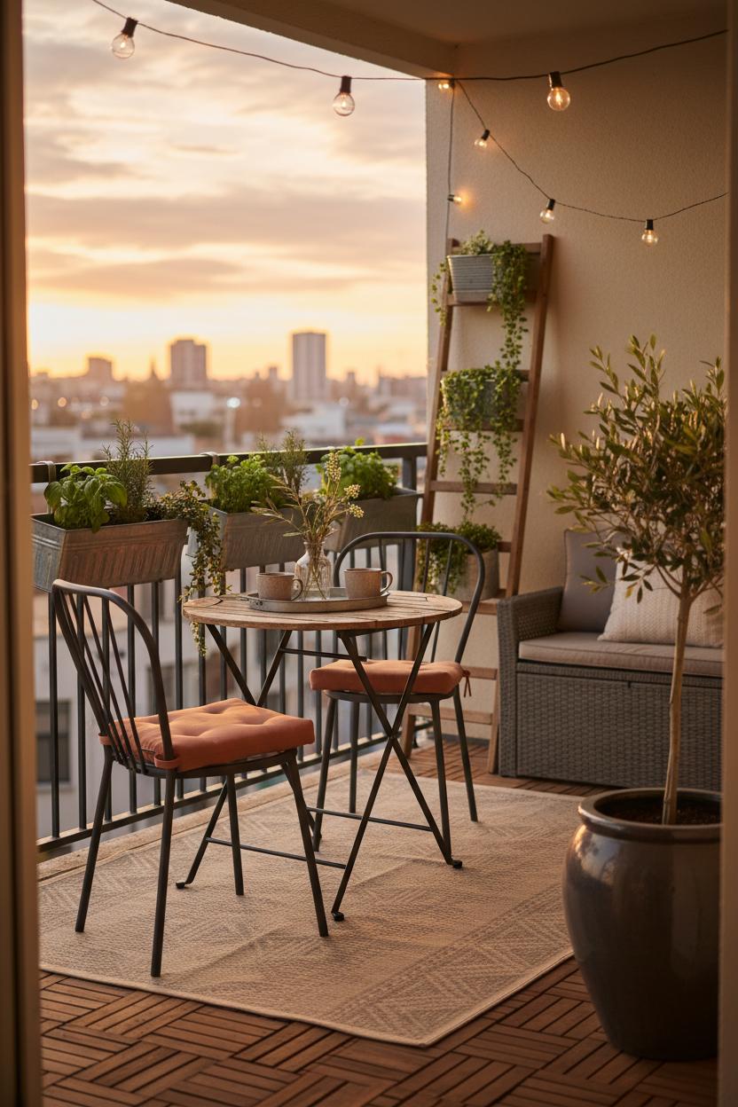 Style your nook like a tiny dining room. A small outdoor rug anchors everything and instantly defines the zone, even on a balcony. Keep cushions in a sun-washed neutral and add one pop of color to tie in surrounding balcony decor. Layer in balcony planters to go vertical and free up floor area—rail-hung boxes for herbs, a slim ladder shelf for trailing vines, maybe a single sculptural pot to ground the corner. As the sun dips, drape outdoor string lights along the railing or zigzag them overhead for that golden-hour glow. If you’ve room, a compact storage bench doubles as extra seating and hides throws, citronella candles, and tabletop linens, making end-of-day cleanups effortless.