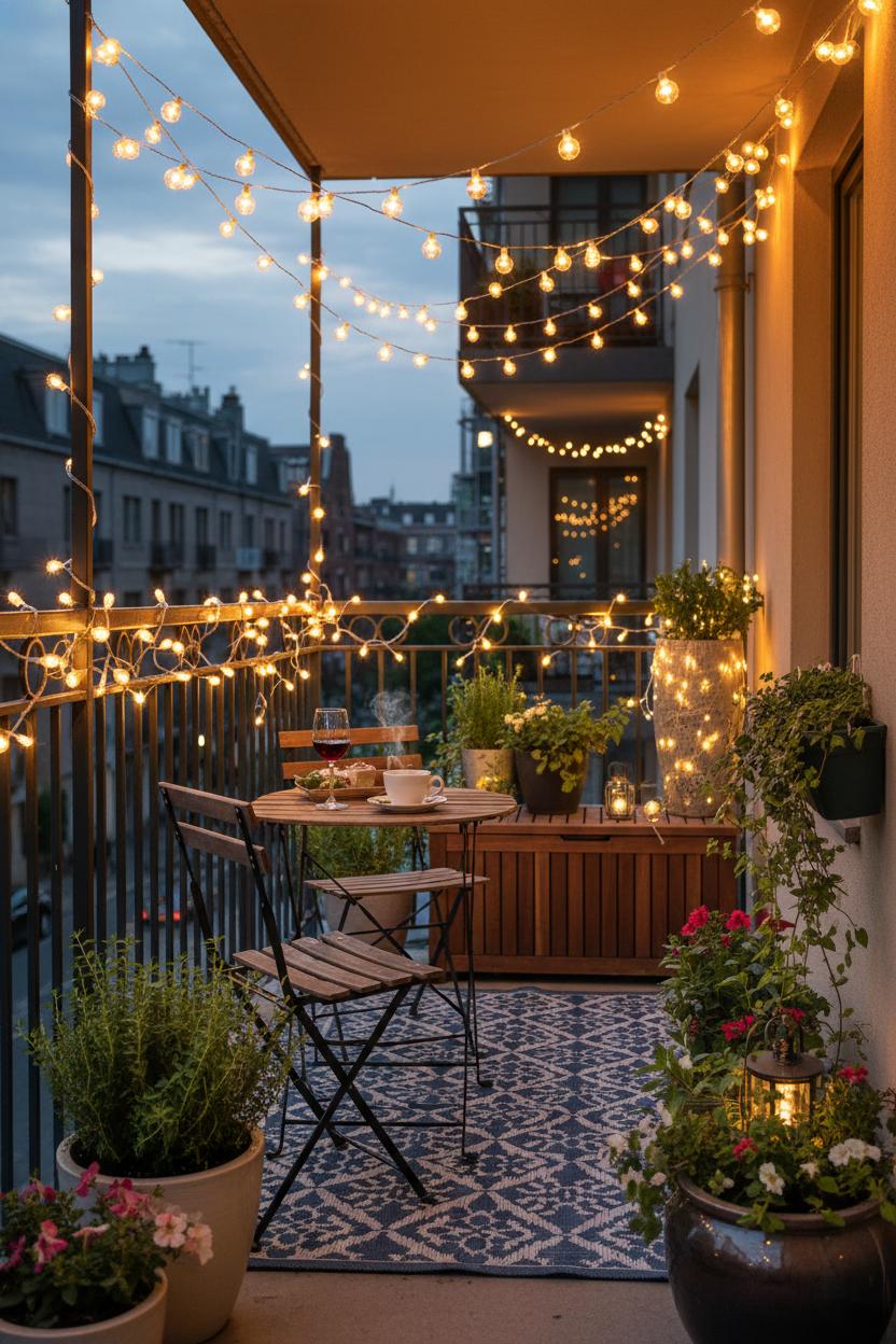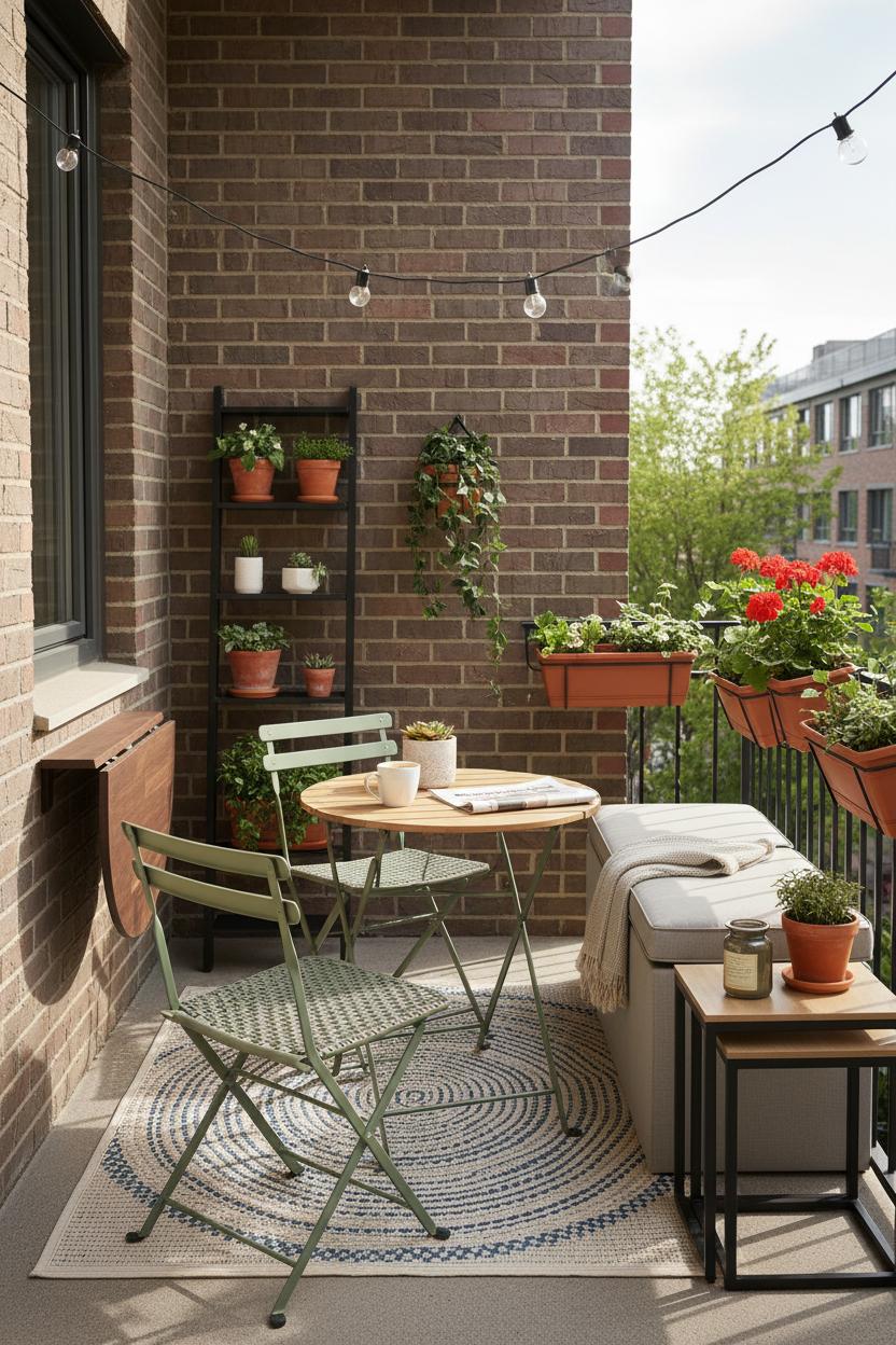 Go vertical to free up precious square footage. Railing-mounted balcony planters and slim ladder shelves lift greenscape off the ground, creating a leafy backdrop that feels lush without crowding your path. Clip-on or draped outdoor string lights instantly dial up the charm, tracing the balcony line or zigzagging overhead for a warm, café glow after dusk. Keep your palette cohesive—neutral foundations with a pop of terracotta or sage—so your balcony decor reads airy, not busy, and choose finishes that can handle the elements (powder-coated metal, resin wicker, teak). In an outdoor small space, multipurpose is everything: a foldable bar cart rolls out for happy hour, then tucks beside the bench; a compact ottoman opens for extra storage and moonlights as a coffee table with a tray on top. With a few thoughtfully chosen, space-saving furniture pieces—your bistro set, that trusty storage bench, a small outdoor rug underfoot, and green layers of balcony planters—you’ll have a petite perch that feels cozy, polished, and perfectly you.