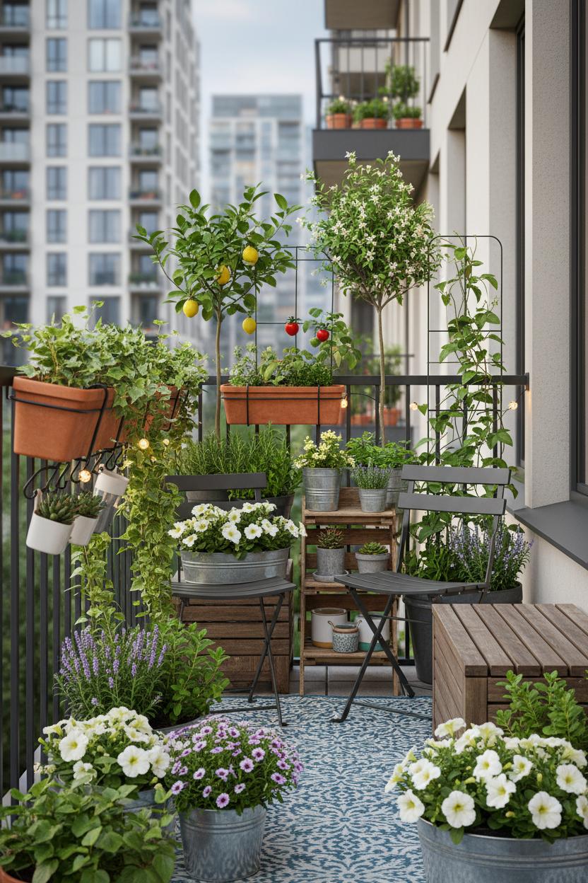 When floor space is precious, let your greenery climb. Rail-hanging pots and slim balcony planters turn the perimeter of your space into a living frame, softening the edges and surrounding you with texture and scent. Think of it as vertical layering: trailing ivy or sweet potato vine spilling over the rail, mid-height herbs like rosemary, mint, and lavender for snipping, and a few upright stars—dwarf citrus, a compact tomato, or a trellised jasmine—reaching skyward. Group planters in threes for a lush, intentional look, and repeat colors or materials to keep your balcony decor cohesive; matte black brackets with terracotta, or galvanized metal with creamy neutrals, both feel timeless. If watering worries you, look for self-watering inserts and tuck moisture-loving plants together to create a tiny microclimate. A narrow ladder shelf or corner plant tower adds more levels without hogging the walkway, while S-hooks under the rail make hanging petite pots or tools a snap. The result is a soothing, living backdrop that proves some of the best small patio ideas grow up, not out.
