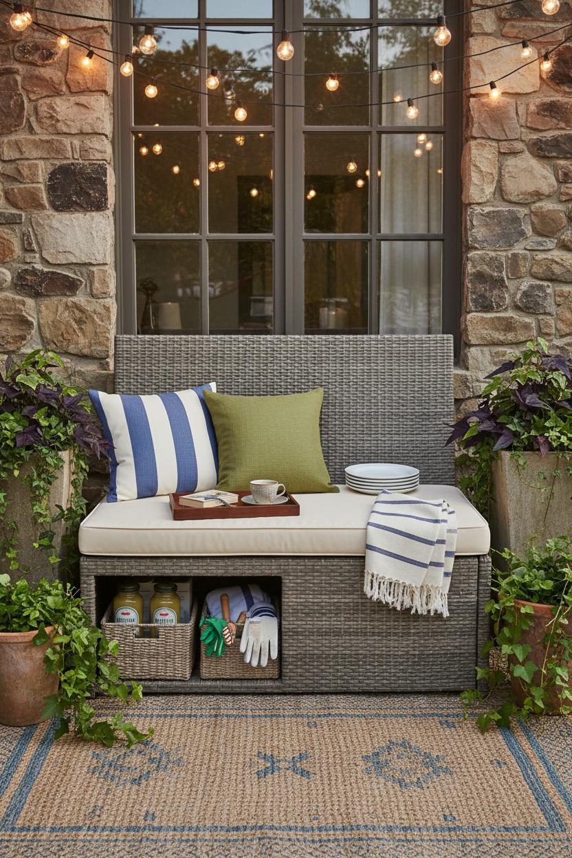 Inside the storage bench is where the real magic happens. Corral citronella candles, a folded throw, extra seat cushions, and a stack of melamine plates in simple bins so it’s easy to grab-and-go when guests arrive. Stash a tiny tool kit and potting gloves for plant upkeep, or kids’ chalk and card games for spontaneous weeknight hangs. If your space doubles as a micro mudroom, slide in a boot tray and a towel for wet paws. With everything tucked away but within arm’s reach, cleanup is a two-minute affair—and your stylish little nook stays ready for every moment, from solo morning journaling to an impromptu Friday night cheers.