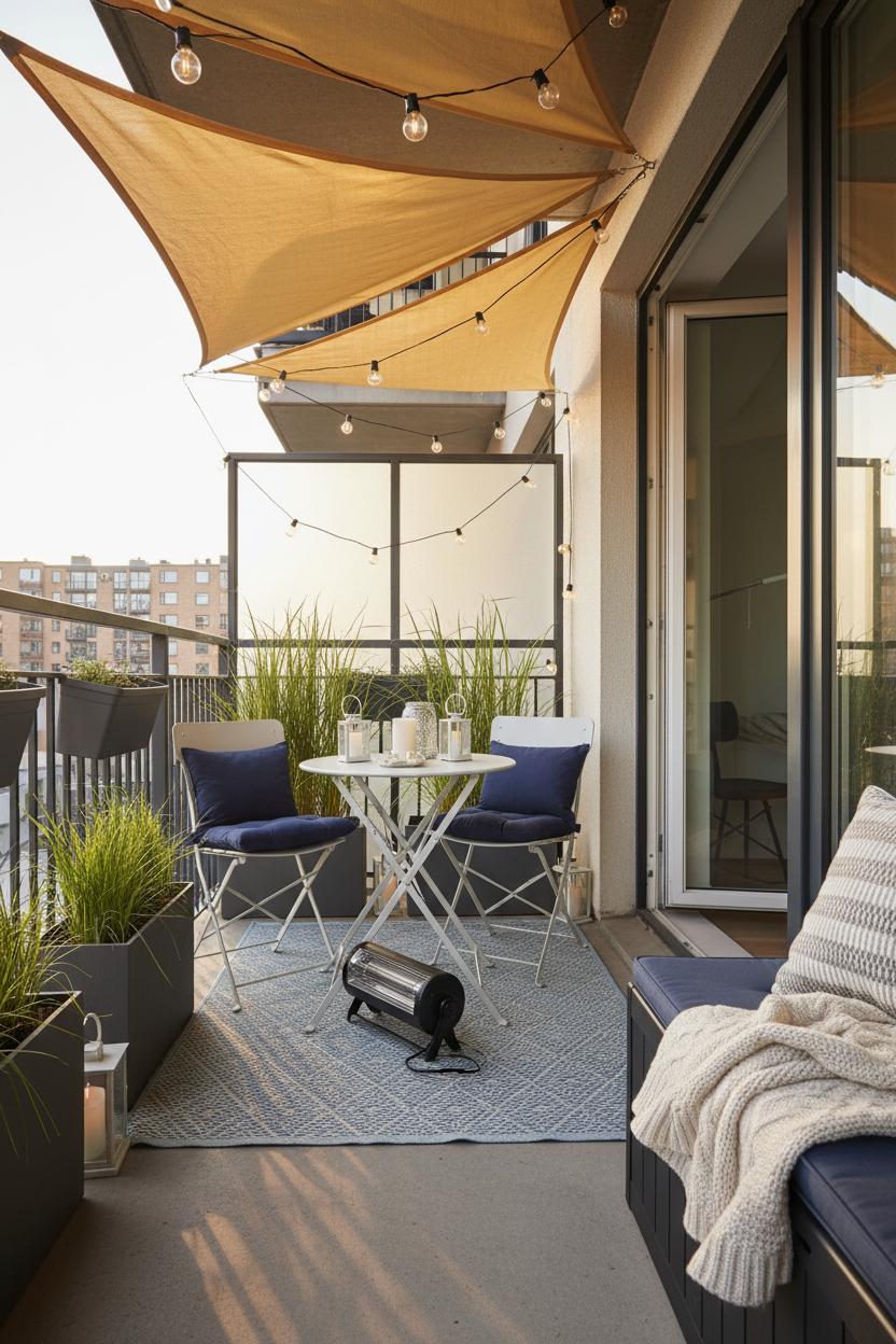 Think of all-season comfort as a gentle layering act: shade for bright afternoons, warmth for crisp evenings, and weatherproof textiles that feel cozy without fuss. For shade, skip bulky canopies and go modular. A slim offset umbrella or a clip-on parasol that swivels over a bistro set lets you chase the sun without eating up floor space, a win for any outdoor small space. On balconies, tension-rod outdoor curtains or a petite shade sail strung corner-to-corner soften glare and add instant resort vibes. If you’re short on railing space, let balcony planters do double duty—tall grasses or bamboo create dappled shade and privacy, while also anchoring the look. These small patio ideas keep sightlines airy and layouts flexible, especially when paired with space-saving furniture that folds, stacks, or tucks neatly under a table.