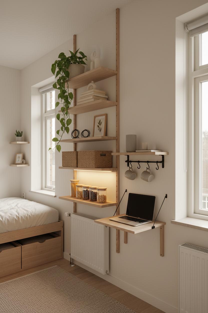 Here’s how to make them work hard. Float a short shelf just above a radiator or along that skinny sliver beside a door; tuck a narrow ledge over a window for storage without blocking light; or run a trio of floating shelves from desk height to near-ceiling to create a vertical “station.” In a tiny bedroom, mount a slim shelf over the headboard to act as a nightstand alternative (hello, small bedroom tips!), or install a shallow rail-and-bracket system inside the closet to free up the dresser. Pair a foldable desk with shelves above and you’ve built a compact study nook—space saving furniture at its smartest. Add a strip of warm glow under the bottom shelf with LED strip lights and watch the whole wall feel custom. Keep baskets for odds and ends, decant pantry goods into clear canisters in the kitchen, or stagger shelves to leave room for a trailing pothos and your favorite framed print. When floor space is at a premium, let your walls multitask so you can keep the ground open for a slim bench or under bed storage drawers.