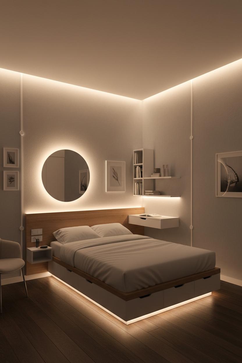 Minimalism is less about owning nothing and more about choosing with intention. In a small bedroom, pick fewer, larger pieces over lots of tiny ones, and opt for leggy, space saving furniture so more floor shows. Streamline your nightstand with wall mounted shelves that float above baseboards, or swap the “desk that eats the room” for a foldable desk that tucks flat when you’re done. Corral the overflow with under bed storage drawers and matching baskets in the closet so everything has a place. For cozy evening vibes, add LED strip lights under the bed, along the headboard, or behind the mirror for a soft halo that doesn’t hog table space. Crisp white bedding, two pillows instead of six, and a single throw at the foot keep things tailored yet welcoming.