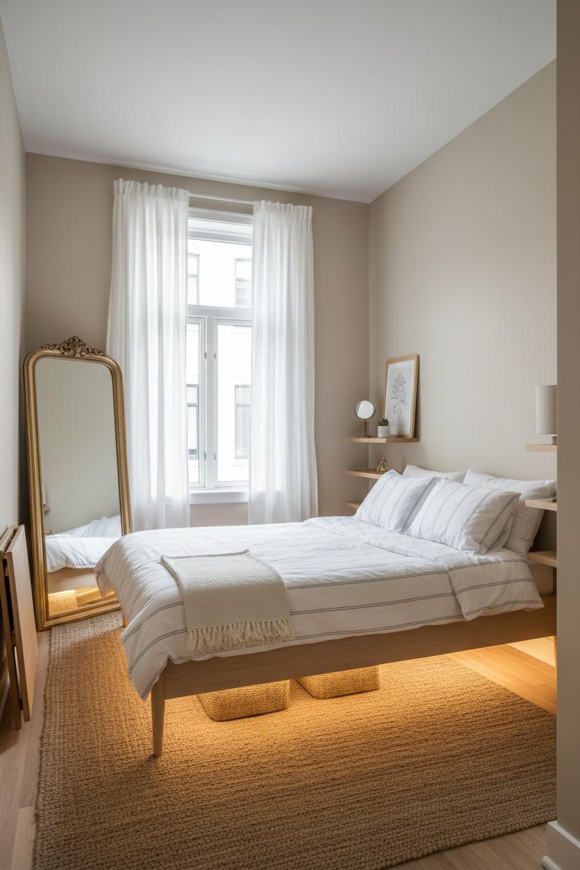 When you’re craving a small room makeover that feels brighter and breezier, start with color and light. Pale, airy hues—think soft white, creamy beige, whisper gray, or a barely-there sage—bounce daylight around and visually push the walls back. For a seamless, lofty feel, paint the ceiling, walls, and trim the same tone in a matte or eggshell finish, then add gauzy curtains hung high and wide to elongate the windows. Mirrors are your secret amplifiers in tiny apartment decor: place a floor-length mirror opposite a window to double the light, or layer a few vintage mirrors as a gallery for sparkle without visual clutter. Even a mirror tucked behind a lamp magnifies glow at night. Keep patterns restrained and repetitive—linen stripes on the duvet, a jute rug, a single botanical print—so the eye glides instead of stops. The result is calm, cohesive, and deceptively spacious.