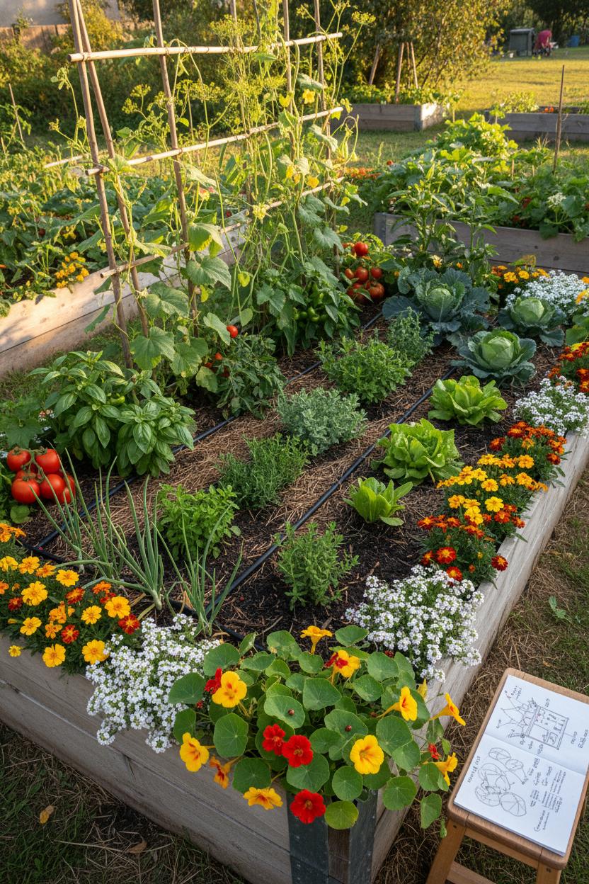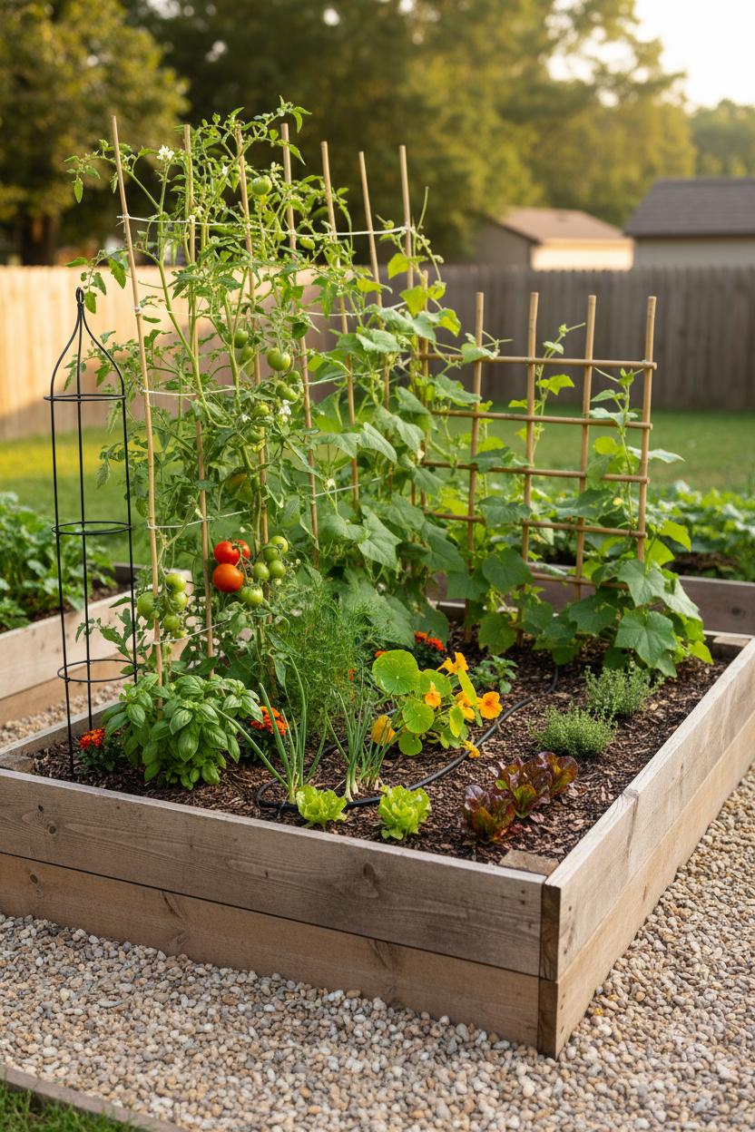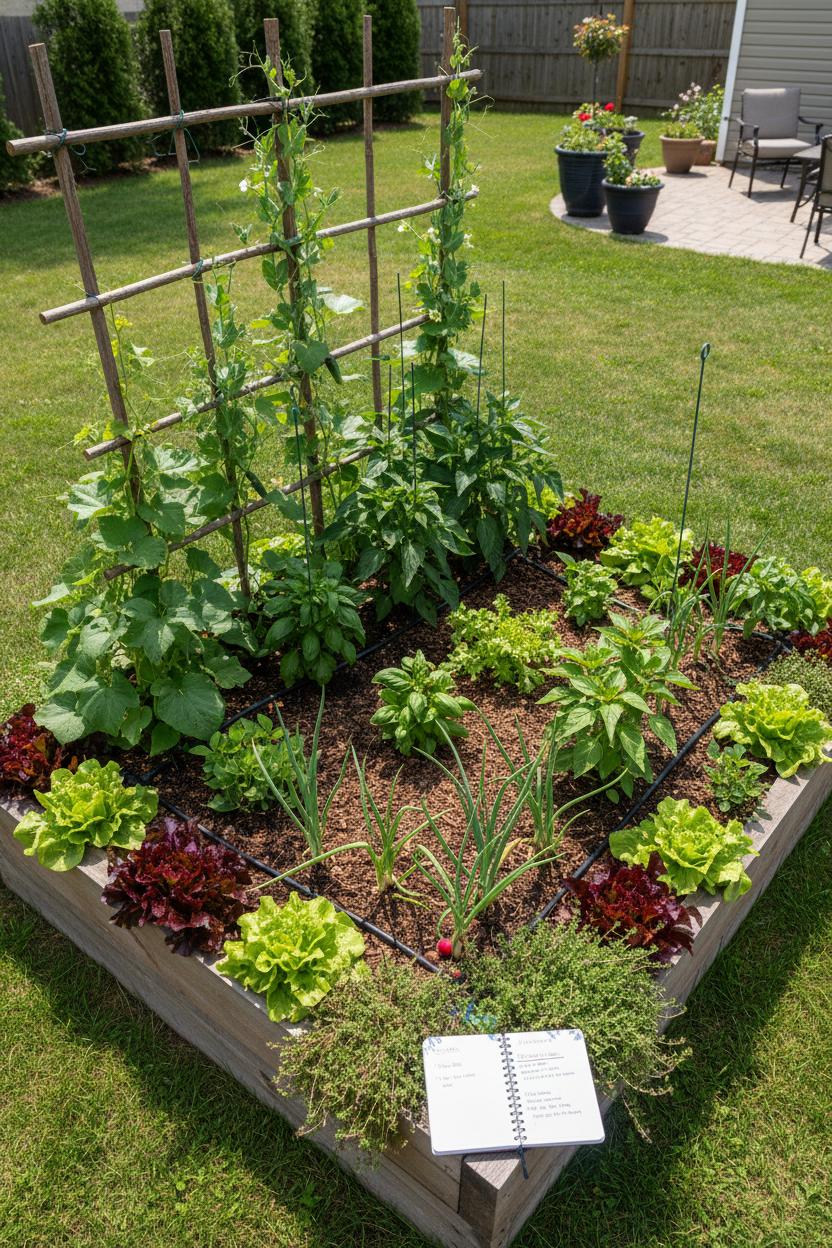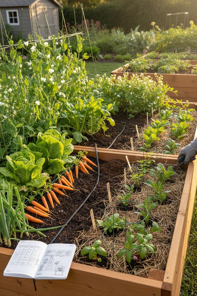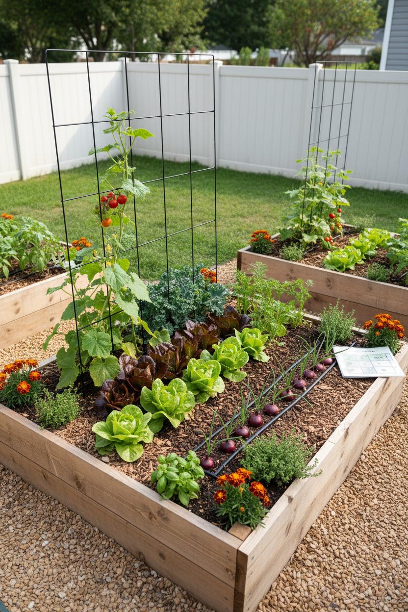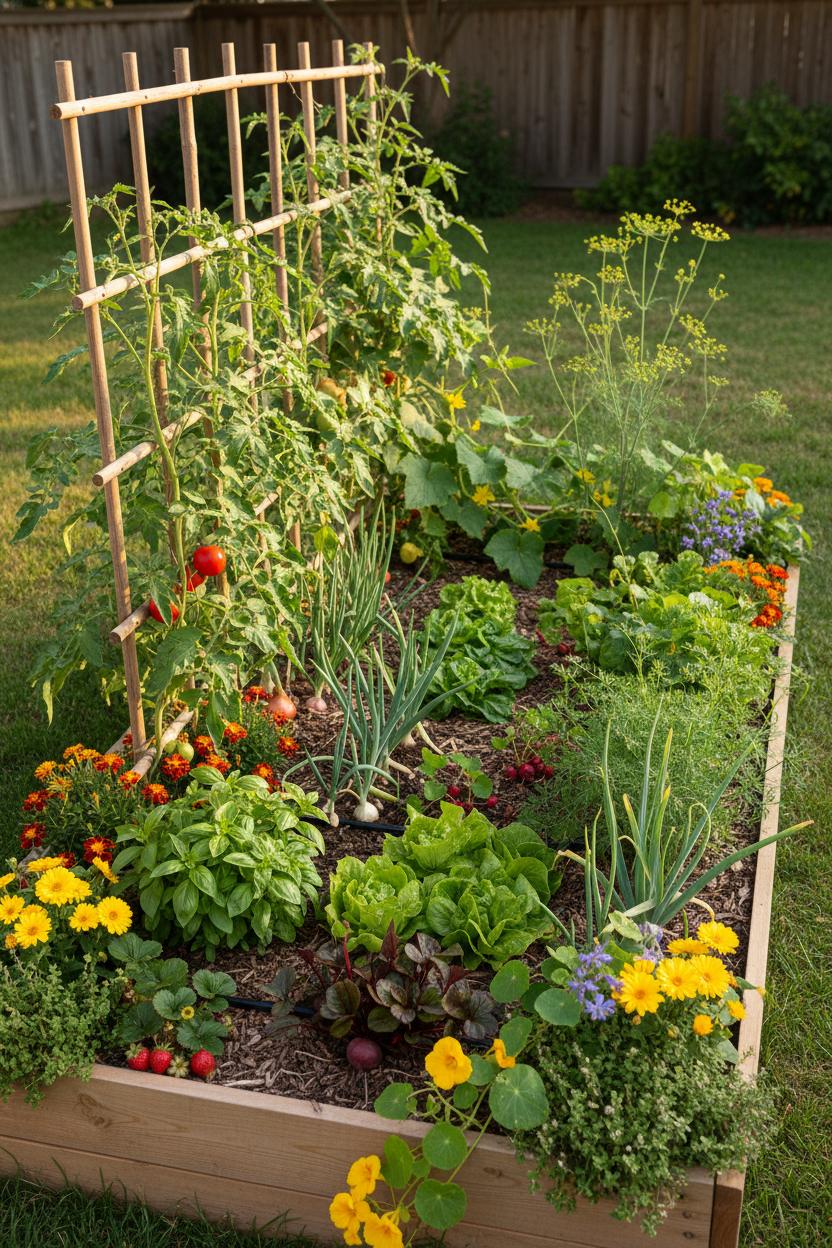 When space is tight, think in layers, directions, and timing. Start by treating every edge as prime real estate: line the sunny sides of a 4×8 raised bed with low growers like lettuces, strawberries, or thyme, and save the center for taller anchors—tomatoes, peppers, or pole beans. In a small garden design, vertical is your best friend, so add a trellis on the north side for cucumbers or peas to climb without shading the rest. Plant in gentle diagonal rows instead of a strict grid; this staggered spacing (a honeycomb effect) tucks more plants into the same footprint while keeping airflow. Then lean into companion planting to stack benefits: basil under tomatoes to maximize scent and pollinators, carrots with onions to confuse pests, radishes marking slow-sprouting carrot rows. Think of your raised bed layout like a layered bouquet—tall in back, medium in the middle, frilly and fast around the edges—so everything gets light and nothing feels crowded.