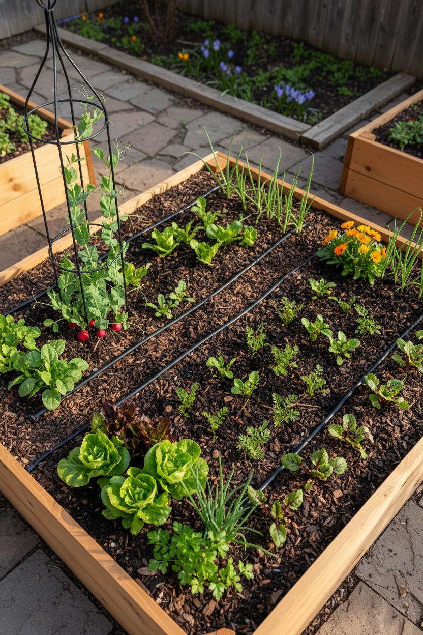 Think of your raised beds as a little stage that changes set pieces with each season. In early spring, I like a raised bed layout that divides a 4×8 raised bed into four gentle “rooms” (roughly 2×4 each) in my garden planner; this makes rotation simple and keeps everything feeling calm and intentional in a small garden design. Start one quadrant with sugar snap peas climbing a slim trellis, underplanted with spinach and radishes; fill another with leafy lettuces and herbs; reserve a third for fast-rooted carrots and beets; and edge the last with green onions and calendula. Enrich the surface with organic garden soil blended with compost and mulch to wake up the microbes after winter. A drip irrigation kit tucked under the mulch delivers steady sips while you’re busy admiring those first blooms, and companion planting (think dill near lettuce, chives near carrots) keeps the whole space buzzing but balanced.