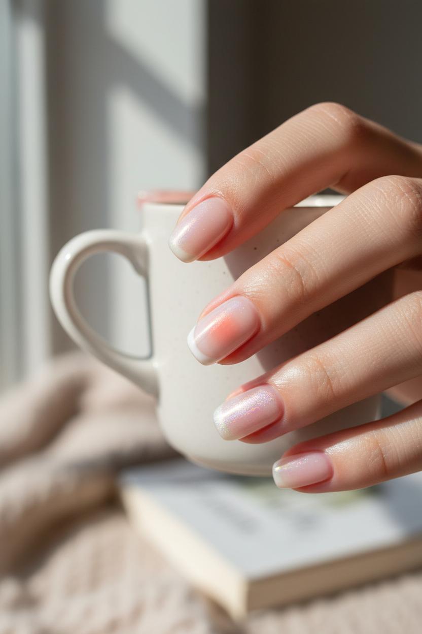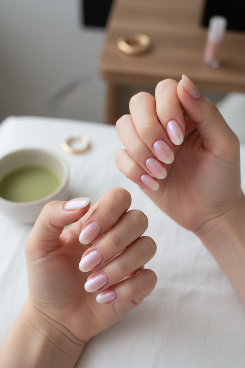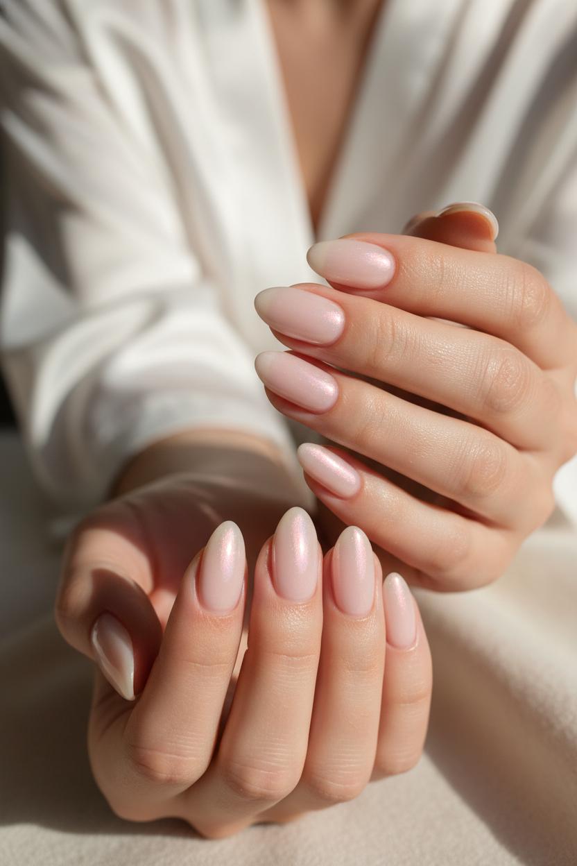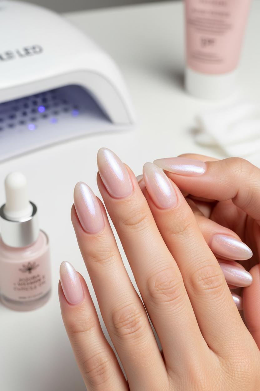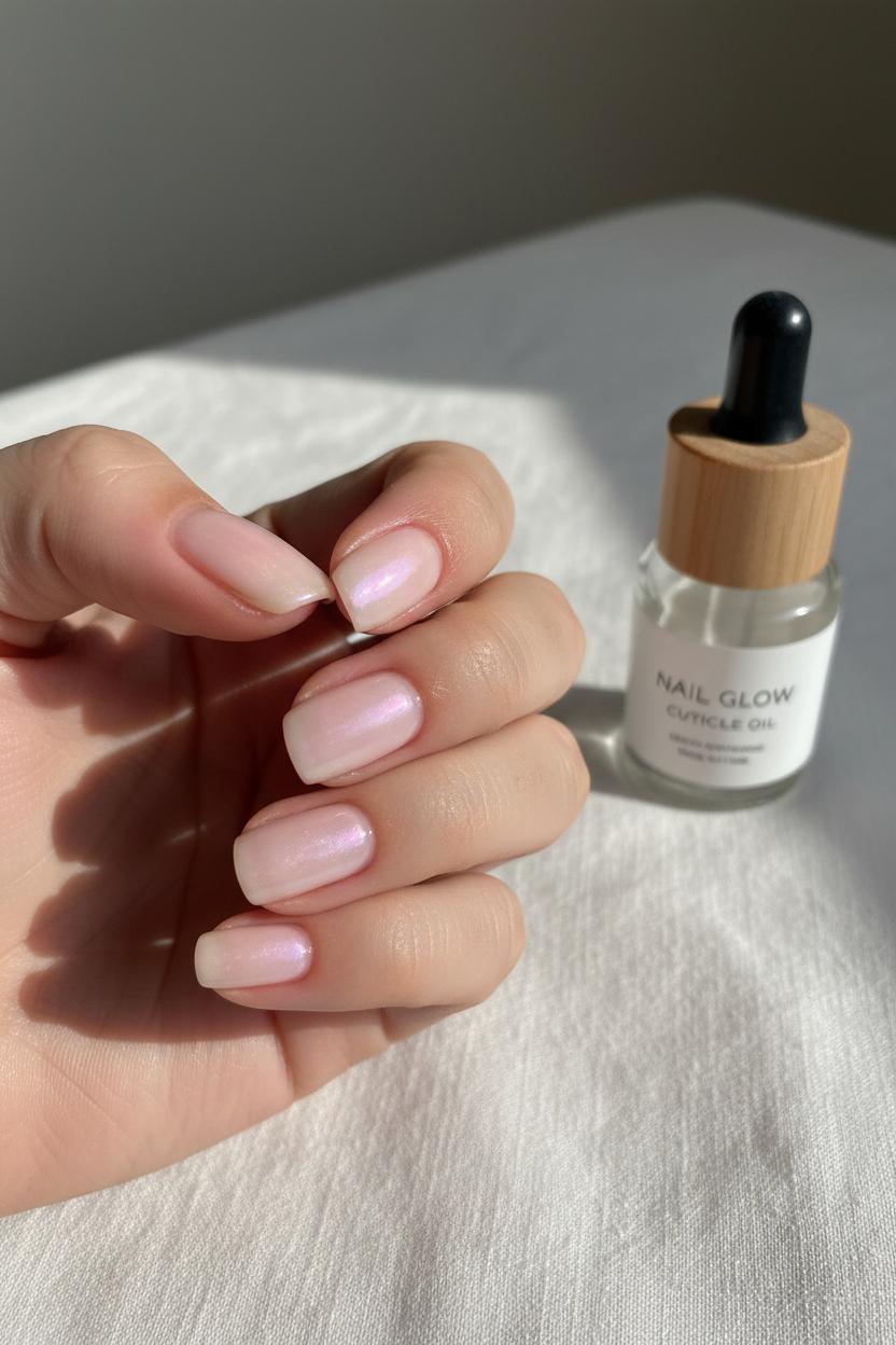 To get the look at home, start with care: massage in cuticle oil and softly shape your tips—short to medium, oval or rounded square keeps everything modern and neat. Lay down a smoothing base, then sweep on one to two coats of sheer pink nail polish for that healthy, milky tint. Tap a whisper of chrome powder nails over the tacky layer for the signature halo, and lock it all in with a high-gloss gel top coat. If you’re going the gel route, a quick cure under a UV LED nail lamp gives you that wet-look shine that lasts and resists chips, perfect for the low-maintenance agenda. Prefer subtler shimmer? Try a micro-fine pearly topper just on the center of each nail for a soft-focus glow. Cooler tones feel icy-fresh; warmer tones read like sunlit cream—both land squarely in the clean-girl sweet spot.