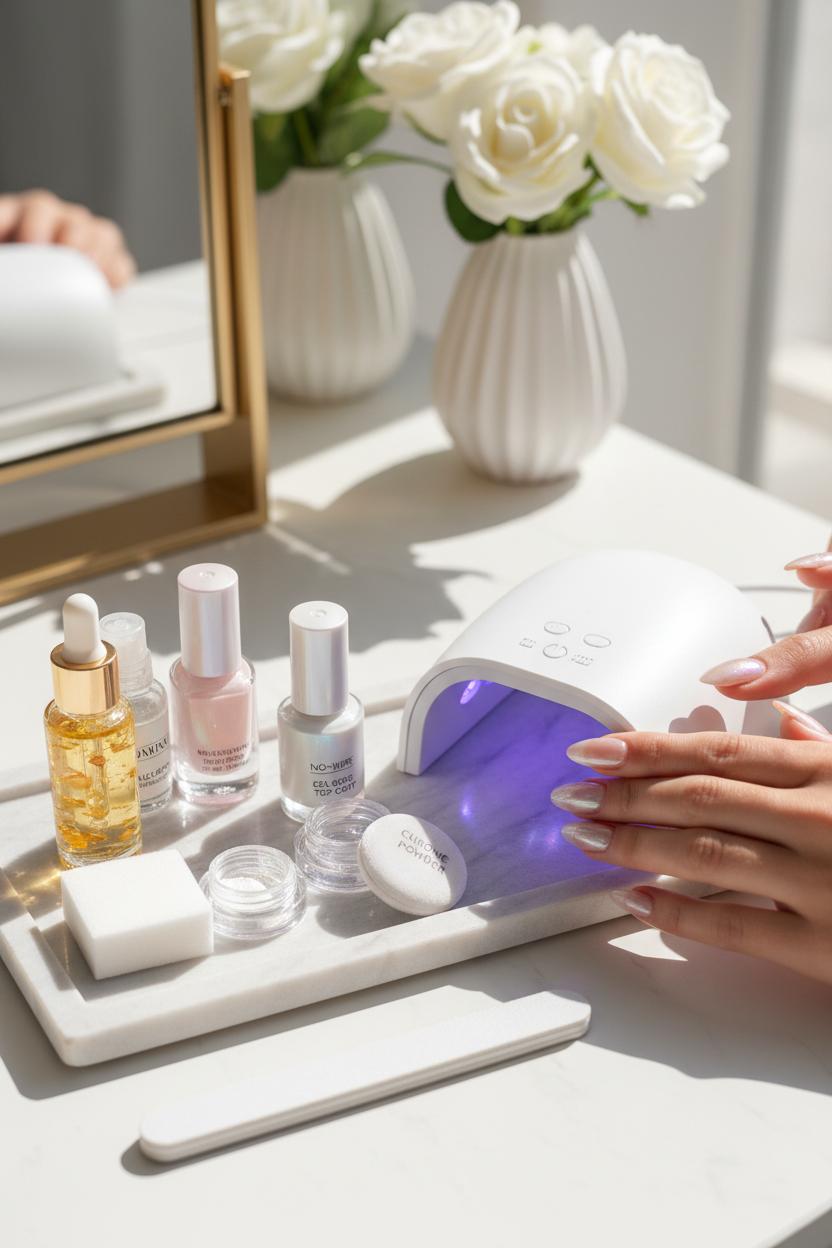 Application matters as much as color. Start with a gentle prep and a thin, self-leveling base. If you’re working with gel, apply two thin layers of sheer pink nail polish and cure each under a UV LED nail lamp for a smooth, glassy canvas. The chrome magic sits on top, so a non-wipe gel top coat is key—buff on your pigment for chrome powder nails only after that top coat cures, then seal everything with another gel top coat for a mirror finish that lasts. Working with regular polish? Let each coat dry thoroughly and swap the chrome step for a pearly topper to mimic chrome nails without the curing. A tiny drop of cuticle oil at the end melts everything together and keeps the look plush and hydrated.