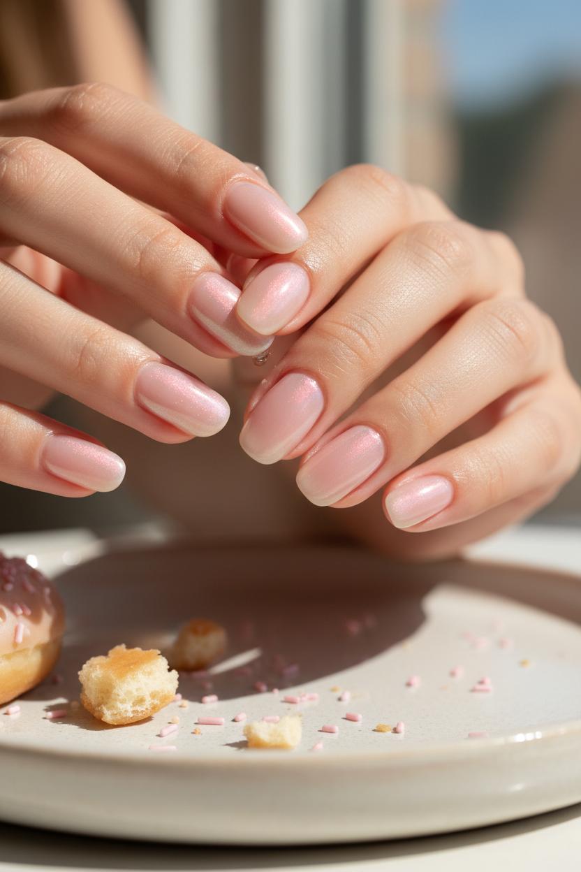 Think of the glaze as a dimmer switch you can slide from barely-there to dazzling—same technique, different intensity. For the soft version of glazed donut nails, keep everything feathery and diffused. Start with a sheer pink nail polish that lets your natural nail peek through, then add the faintest whisper of sheen. If you’re using gel, cure your base and press the tiniest amount of chrome powder onto a no-wipe layer with the lightest touch—almost like dusting powdered sugar. Seal with a thin gel top coat and cure under a UV LED nail lamp for that “lit from within” glow. If you prefer regular polish, let your layers get almost dry before tapping on the softest veil of shimmer, then finish with a glossy topper. The result is the clean girl nails vibe: a neutral manicure that looks effortless, healthy, and unbelievably chic. Don’t forget a drop of cuticle oil to keep everything juicy and photo-ready.