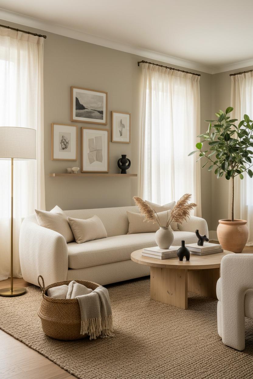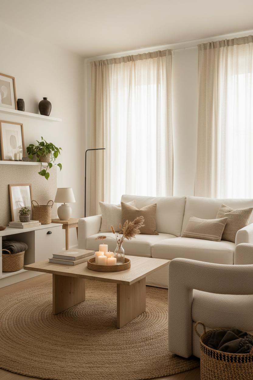 Begin with a palette that feels like a soft breath—think warm creams, oat milk beige, pale stone, and gentle gray—and let those tones set the mood for an aesthetic living room that’s calm but never flat. The goal is to lay down quiet layers of neutral decor that feel collected rather than contrived. An inviting anchor piece, like a deep-seated cream sofa, instantly makes the space feel plush and cohesive; then echo its softness with linen curtains that filter light like a hazy afternoon. Add a light wood coffee table to introduce organic warmth and a bit of visual grounding, and keep surfaces matte so they absorb light instead of bouncing it back. These simple living room ideas create a beautiful base where textures do the talking: think woven baskets, nubby throws, and tactile ceramics that bring dimension without crowding the eye.