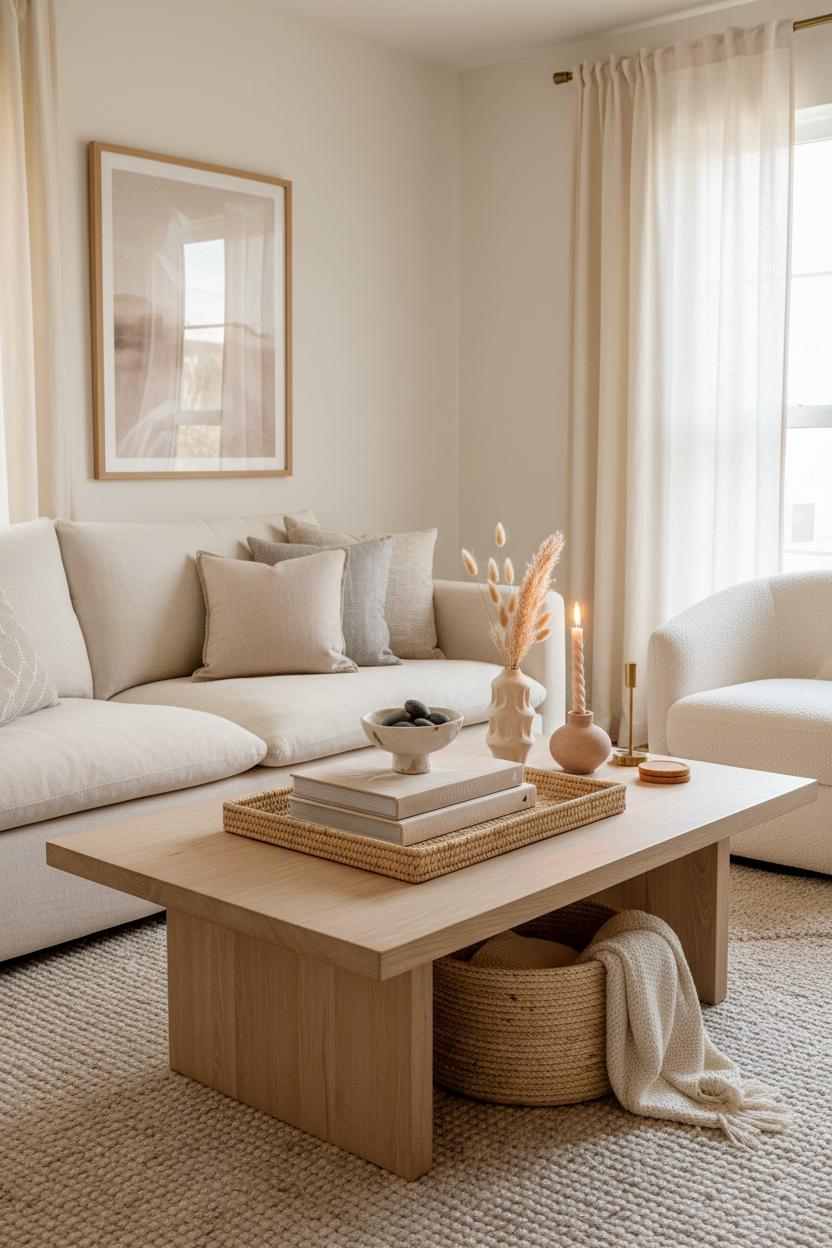 A light wood coffee table is the secret ingredient for a calm, collected aesthetic living room, acting like a soft sunrise at the center of your space. Its grain brings warmth without heaviness, especially next to a plush cream sofa and a cozy boucle accent chair, where the textures play off one another in that modern boho-meets-tailored vibe. Keep the palette hushed—think neutral decor layered with creamy whites, sandy taupes, and a whisper of gray—then let the table be the place where those tones mingle. With breezy linen curtains filtering the light, the whole scene feels grounded yet airy, the kind of quietly styled corner that invites you to slow down.