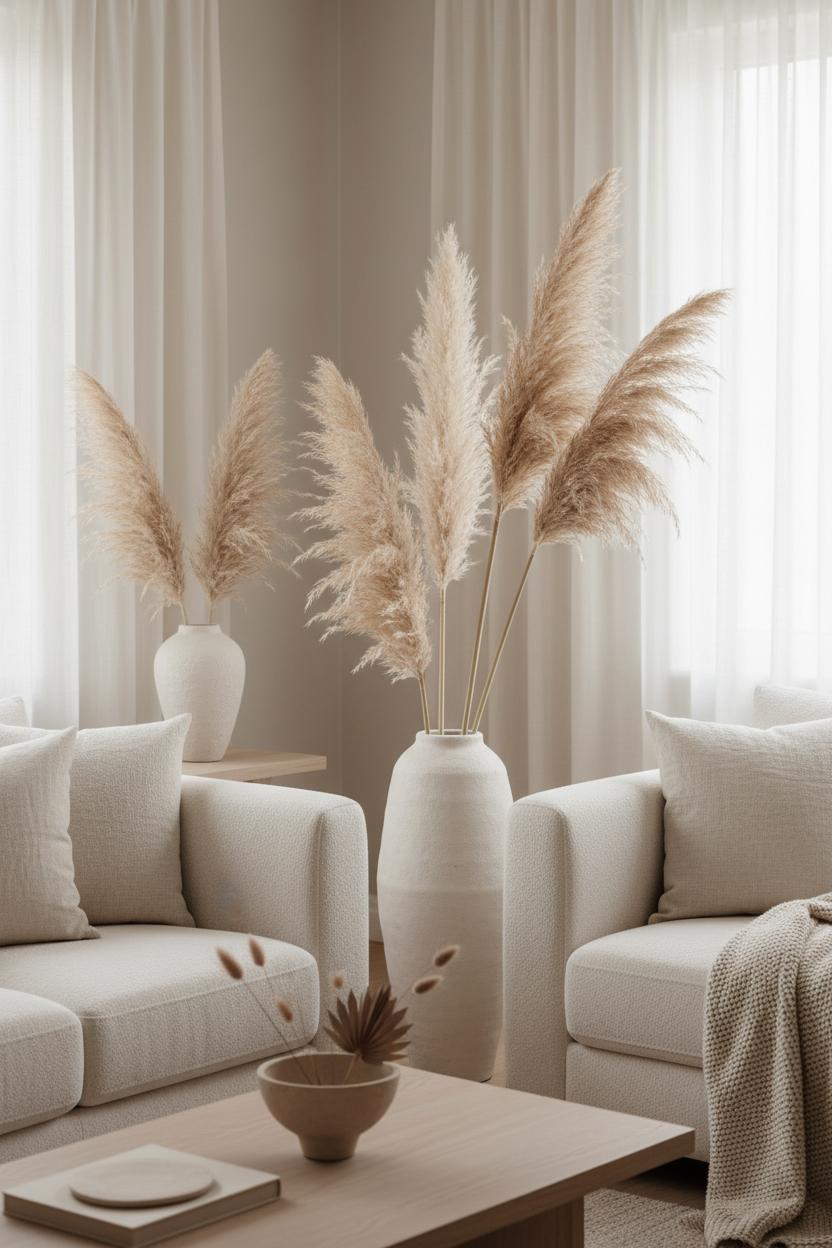 Placement is where the magic happens. Tuck a floor vase beside a cream sofa to soften the corner of the room, or let a smaller bundle rest in a low bowl on a light wood coffee table where the feathery texture contrasts beautifully with smooth grain. A few petite stems on a console behind a boucle accent chair add touchable texture without visual clutter—perfect for a minimalist living room that still craves personality. If you have linen curtains, position a vase so the breeze brushes the plumes; the movement adds life to an aesthetic living room without introducing bold color. For a modern boho twist, mix pampas with dried palm spears or bunny tails, and vary your vessels—woven rattan, milky ceramic, and clear glass—to layer materials while staying tonal. Keep arrangements out of direct airflow and high humidity to preserve fluffiness, and rotate stems seasonally to refresh the vignette. Simple, tactile, and endlessly adaptable, pampas grass decor is one of those living room ideas that turns quiet corners into soft moments, and makes the entire space feel intentionally serene.