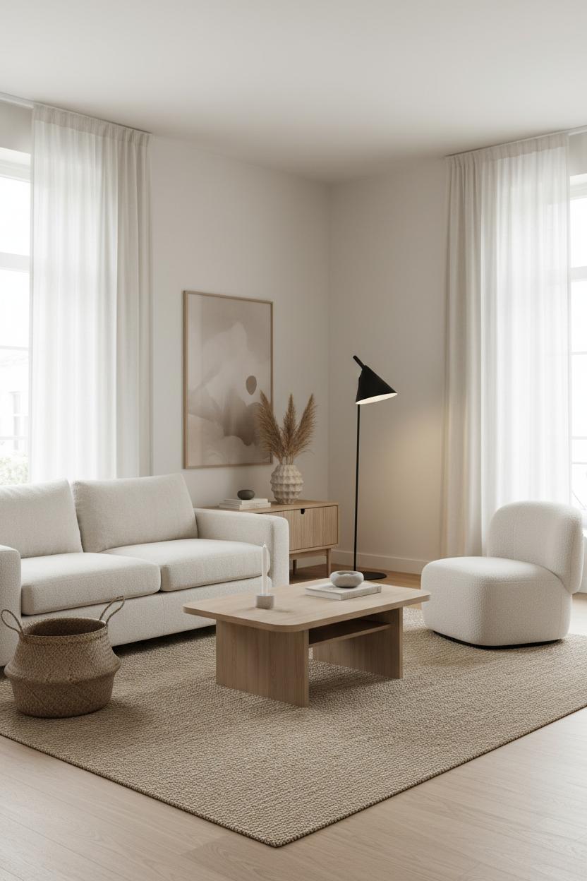From there, layer in a touch of soul. A boucle accent chair gives the room a sculptural moment while staying wonderfully neutral, and a low, softly patterned rug ties everything together in a whisper rather than a shout. If you love a minimalist living room, keep accessories edited but intentional—stack a few linen-bound books, place a stone tray on the coffee table, and let one or two organic elements shine, like pampas grass decor in a wide-mouthed vessel. For a hint of modern boho, introduce subtle contrast with handwoven textures or a rattan accent, keeping the palette restrained so the room still reads serene. Art can be tonal too: oversized line drawings, monochrome photography, or a creamy plaster wall piece that adds depth without color. Finish with warm pools of light—paper lanterns, alabaster lamps, or candle glow—to soften corners and make every seat feel inviting. When your foundation is this gentle and layered, everything you add afterward feels effortless, and the entire room hums with understated comfort.