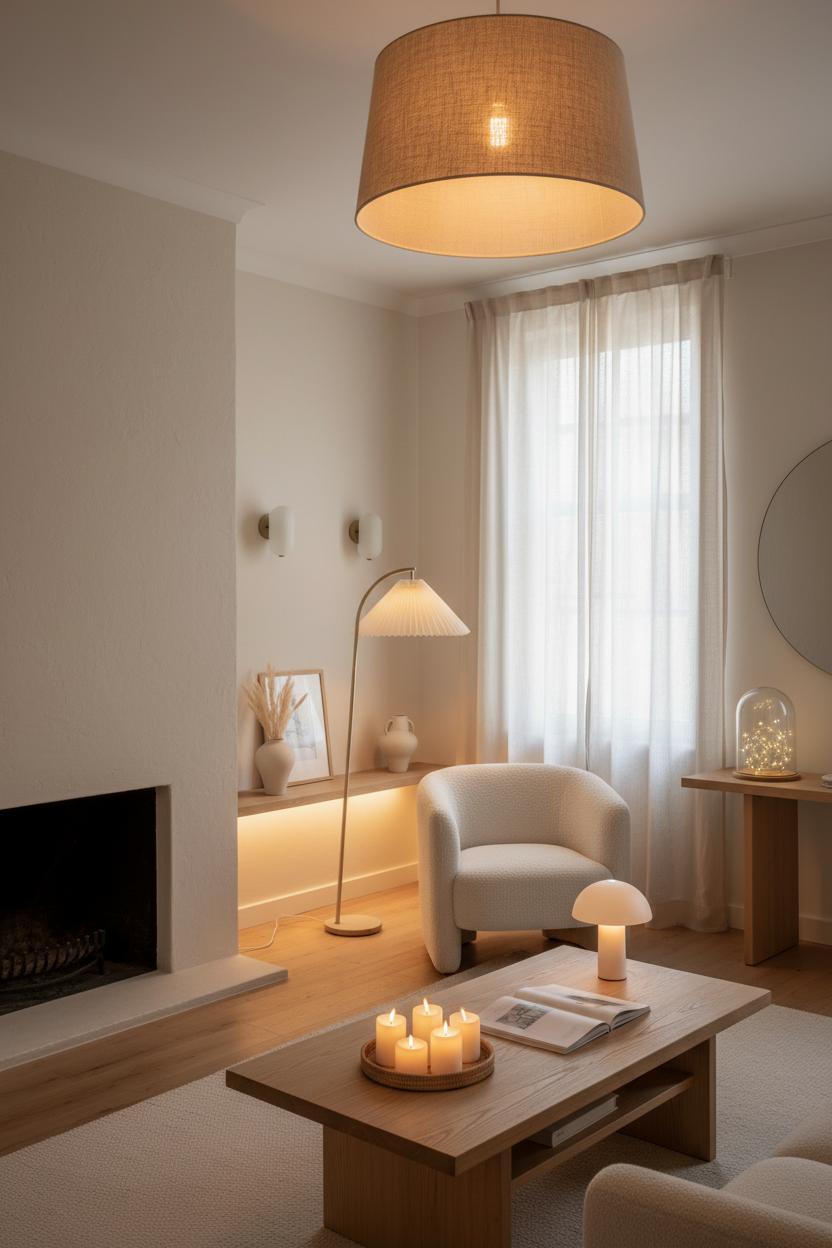 Then build in mid- and low-level light for dimension. A slender floor lamp with a pleated or drum shade near the reading corner casts those pretty, elongated pools that make corners feel intentional and intimate. Try a pair of plug-in sconces flanking art or shelves; alabaster, frosted glass, or rattan shades are beautiful choices for a minimalist living room because they break up brightness without stealing focus. For the coffee table moment, keep it low and warm: a petite rechargeable lamp or clustered votives on a tray glow softly over a light wood coffee table, highlighting natural grain and your favorite books. If you love modern boho touches, tuck a strand of micro lights into a glass cloche beside pampas grass decor, or add a subtle LED strip under a floating shelf to graze textured plaster. Finish with dimmers everywhere so the mood can shift from lively to lullaby with a fingertip. These layered living room ideas let every neutral—from oatmeal linen to sandy oak—look richer and more intentional, turning your space into that quietly radiant haven you pin again and again.