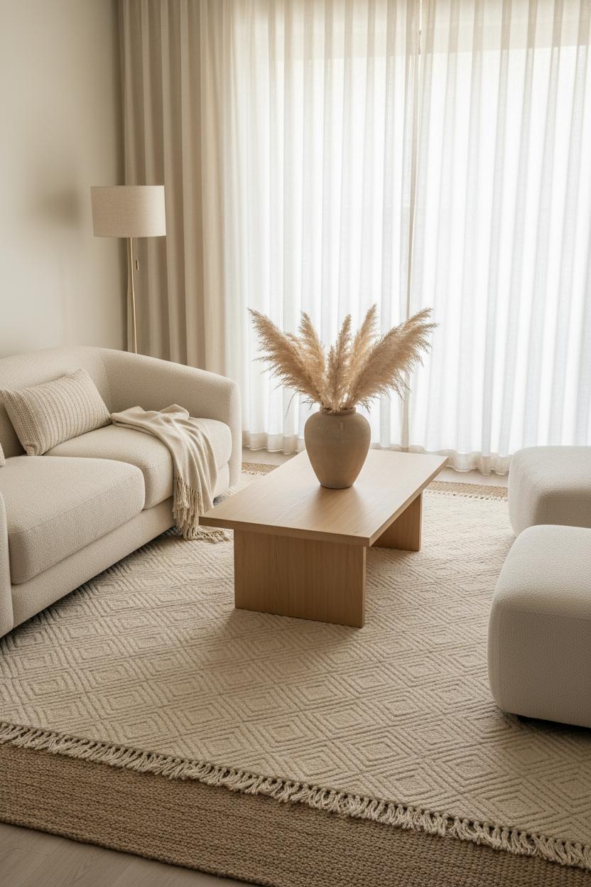 In an aesthetic living room, the right rug quietly sets the mood before a single lamp is switched on. Lean into nubby neutrals—think wool, jute, and cotton with a soft, tactile hand—to warm your neutral decor without adding visual noise. A heathered oatmeal or sand-toned rug feels instantaneously calm and looks luxe beneath a cream sofa, while the gentle texture reads as cozy rather than busy. If your seating skews sculptural, like a boucle accent chair, a low-pile wool rug with a subtle geometric weave adds just enough dimension to ground the curves. Layer the look with a light wood coffee table that lets the fibers breathe and reflect light, and finish the perimeter with gauzy linen curtains so natural daylight glows across the texture. A cluster of pampas grass decor in a ceramic urn echoes the rug’s earthy tones, tying the whole palette together without breaking the serene line of sight.