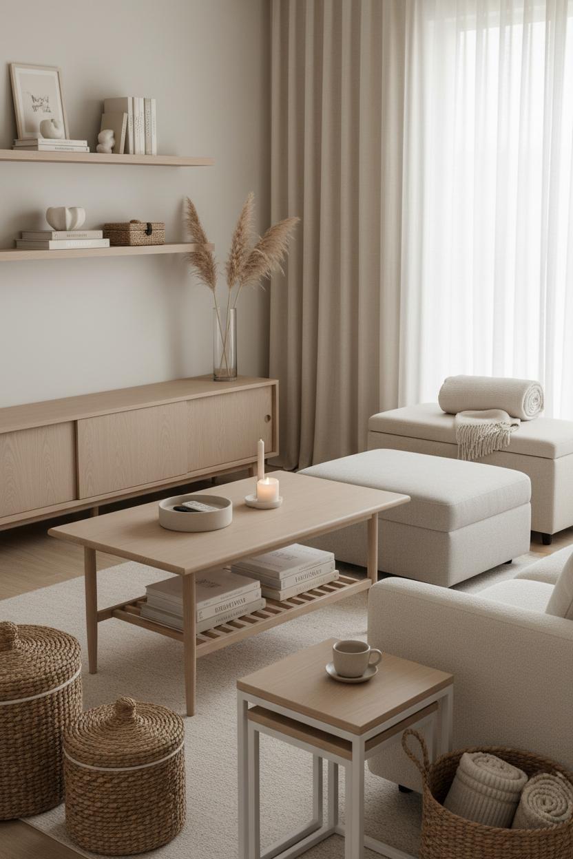 When you’re curating a minimalist living room with a soft, neutral decor palette, the secret to serenity is smart storage that blends right in. Think pieces that multitask without shouting about it: a light wood coffee table with a lower shelf to corral a stack of design books and a lidded tray for remotes, a slim media console with closed doors to hide cords and consoles, and a linen-covered storage bench that tucks throws away at day’s end. If you love that modern boho mix of texture and calm, weave in a few natural baskets beneath consoles and beside a cream sofa; choose lidded styles so everything looks intentional. A lift-top ottoman pulls double duty as extra seating and a quick tidying zone before guests arrive, while nesting side tables slide together when you want more floor space and glide apart for tea and a candle moment.