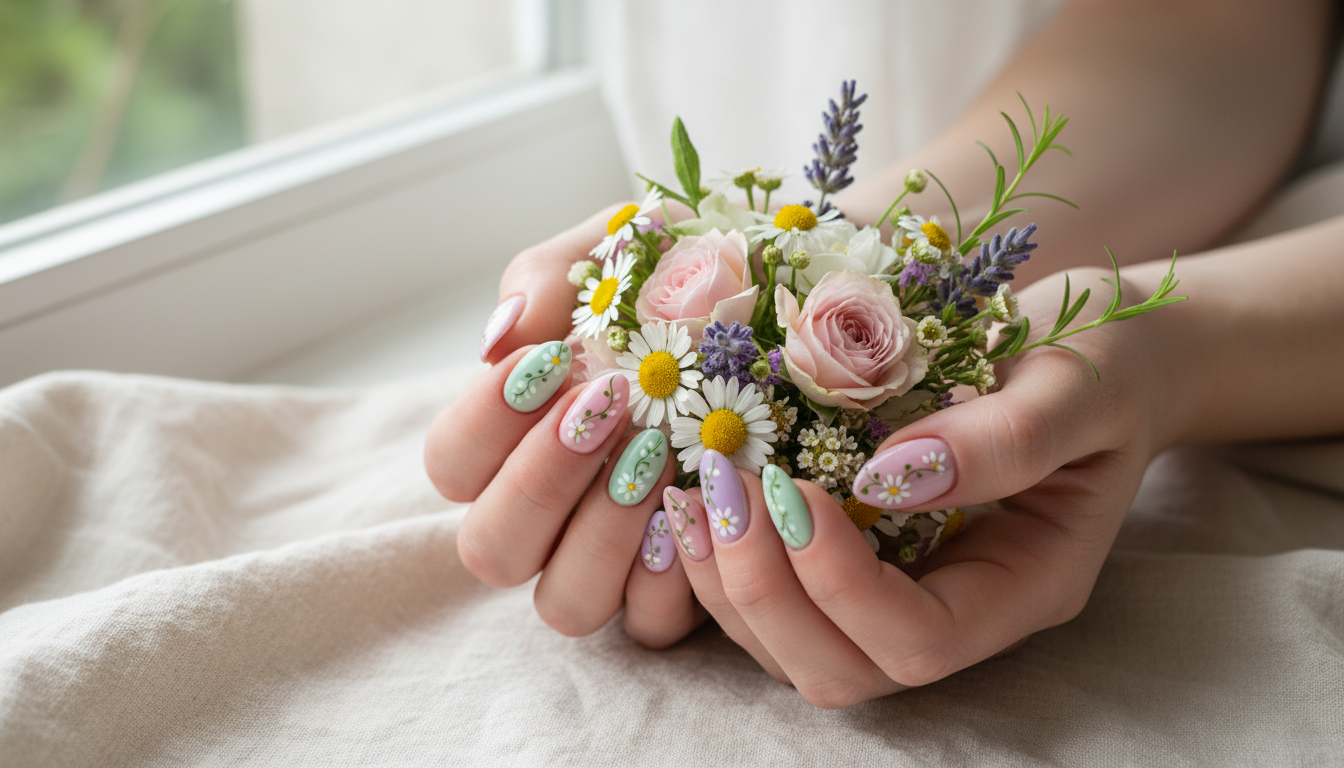 What truly makes soft florals the manicure of the season is their endless personalization. Go tonal with a single shade family across all ten, or create a garden of varied pastels for a subtle, mismatched moment. Short nails wear scattered buds beautifully; longer almond shapes love a delicate vine trailing the sidewall. Swap daisies for baby’s breath, tulip tips, or a minimalist blossom at the cuticle to match your mood. It’s easy to see why spring floral nails are the look everyone’s pinning: they feel curated but effortless, romantic yet modern, and they promise that little daily bloom whenever you glance down at your hands.