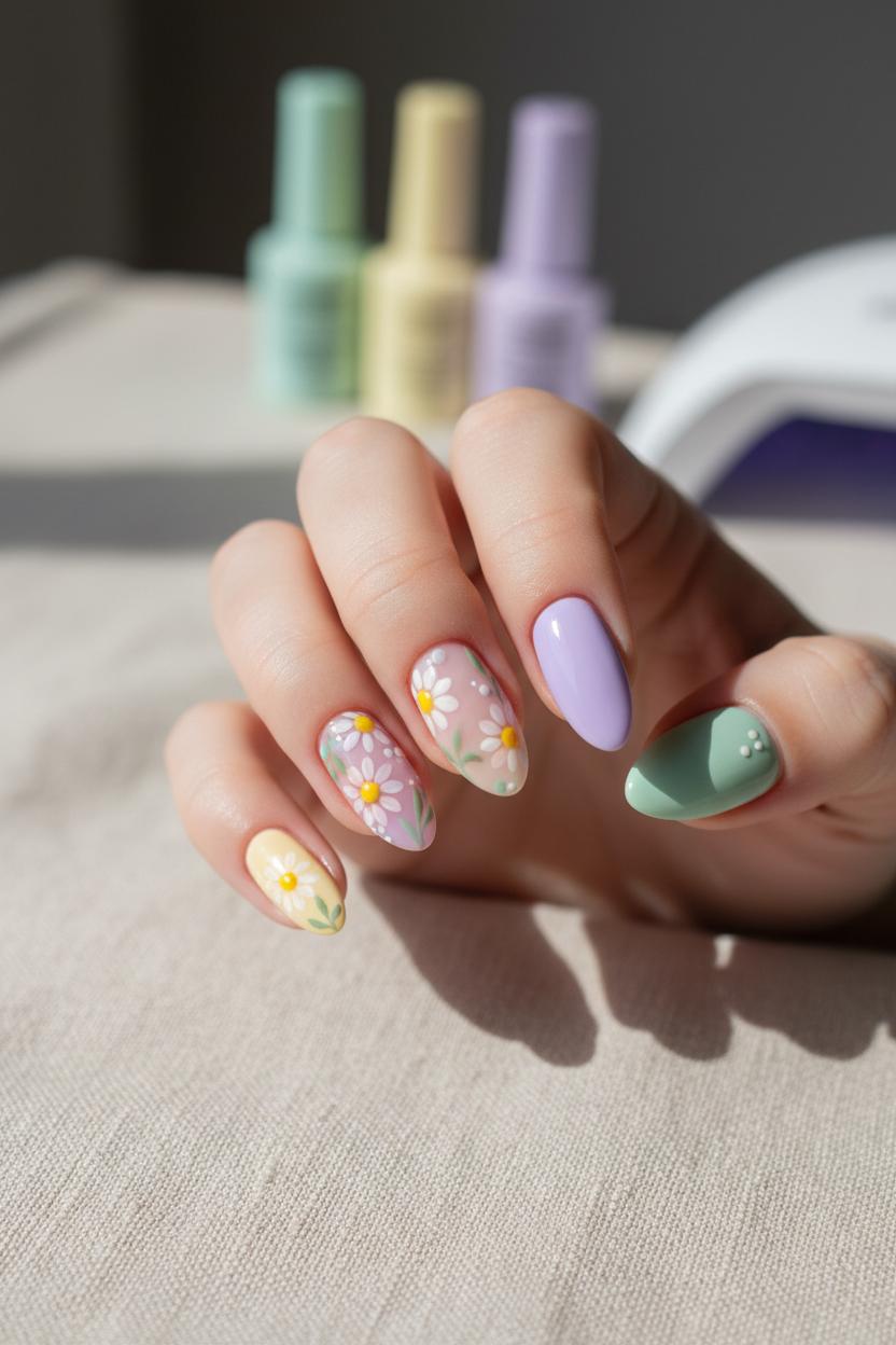For daisy nails especially, tools make the difference between “cute” and “wow.” Dot yellow centers with dotting tools nail art, then pull out petals using detail nail art brushes dipped in your favorite pastel gel nail polish—try mixing a drop of white into your color for highlighted petal tips. Add tiny stems in sage or olive and layer a milky sheer on one accent nail for negative-space balance. If you’re short on time, floral nail stickers can be nestled into your design; seal with two thin top-coat layers so edges vanish. Store your bottles away from sunlight to protect pigments, and build a capsule of four to six shades you genuinely wear. With a curated pastel lineup and a little patience, your spring floral nails will look like a bouquet you painted yourself—soft, fresh, and perfectly in bloom.