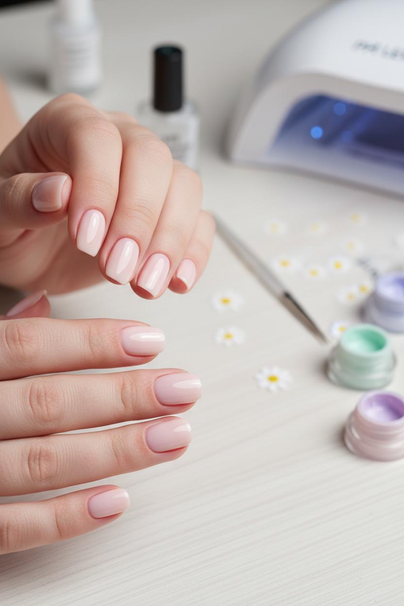 Next, lay down a base that supports your design. A pH bonder or dehydrator can help if you’re prone to lifting, followed by a thin, even layer of base coat. Float it on without flooding the cuticles, cap the free edge, and let it self-level for a few seconds; flipping your hand palm-up briefly helps the apex form on longer nails. Cure according to your bottle under a UV LED nail lamp—don’t rush this step. If your nails have ridges, a rubber or thicker base smooths them so pastel gel nail polish looks buttery and even. For that dreamy, soft-focus look, choose a sheer milky or barely-there pink base; it makes tiny petals pop while keeping the overall vibe airy and fresh.