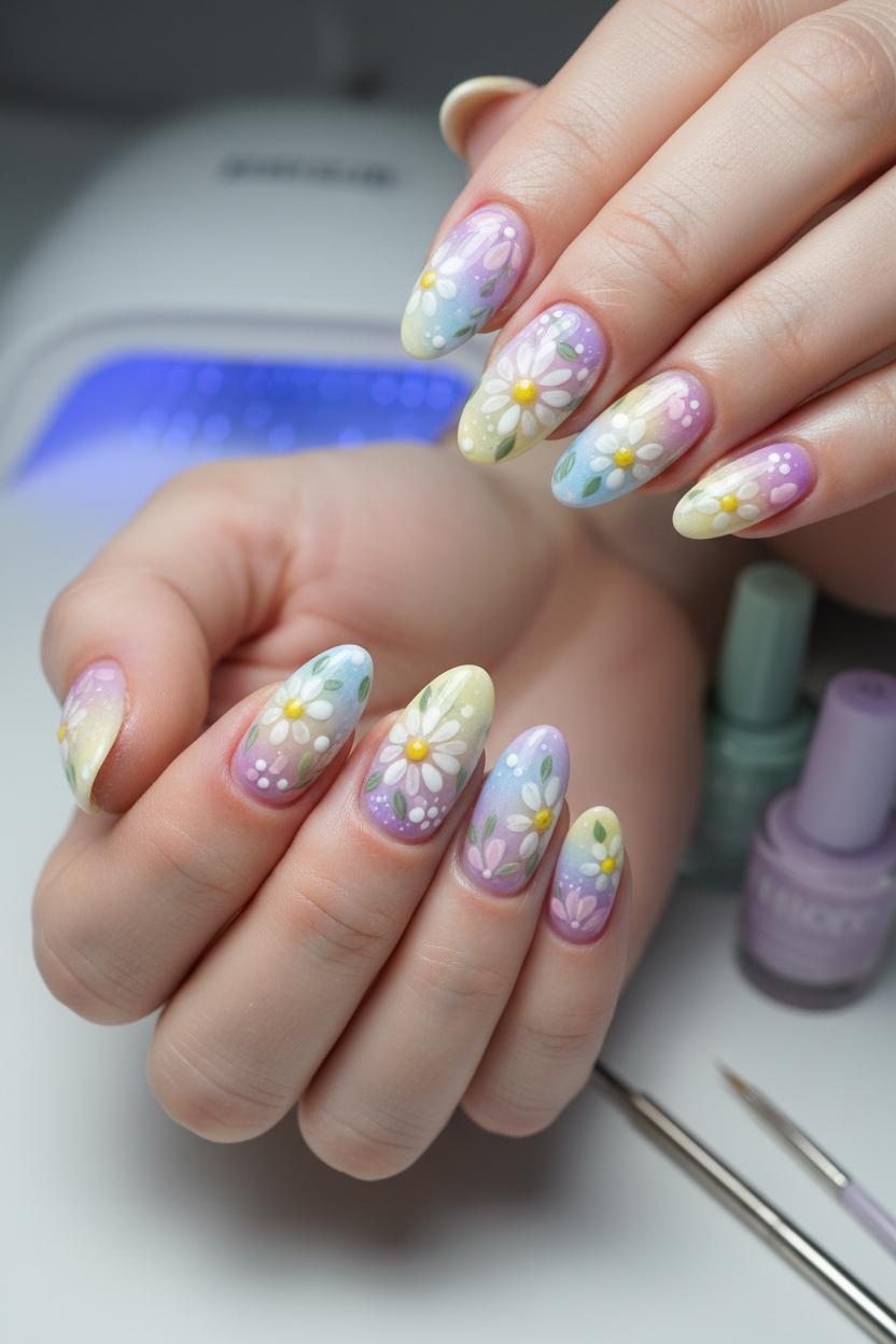 Think of your nails like a watercolor sky at golden hour: soft gradients make pastel nail art feel dreamy instead of sugary. Try a blush-to-mint ombré, a buttery vanilla fading into lilac, or periwinkle melting into peach—each combo instantly reads spring floral nails without a single petal. Apply two or three shades of pastel gel nail polish with a sponge for that cloudlike blend, then refine the fade with detail nail art brushes before curing. Because gel nails keep everything glossy and smooth, you’ll get that pillowy, light-diffusing finish that makes colors look extra velvety under a top coat. A quick cure under a UV LED nail lamp locks in your gradient so it won’t dent while you’re planning the floral moment to layer on top.