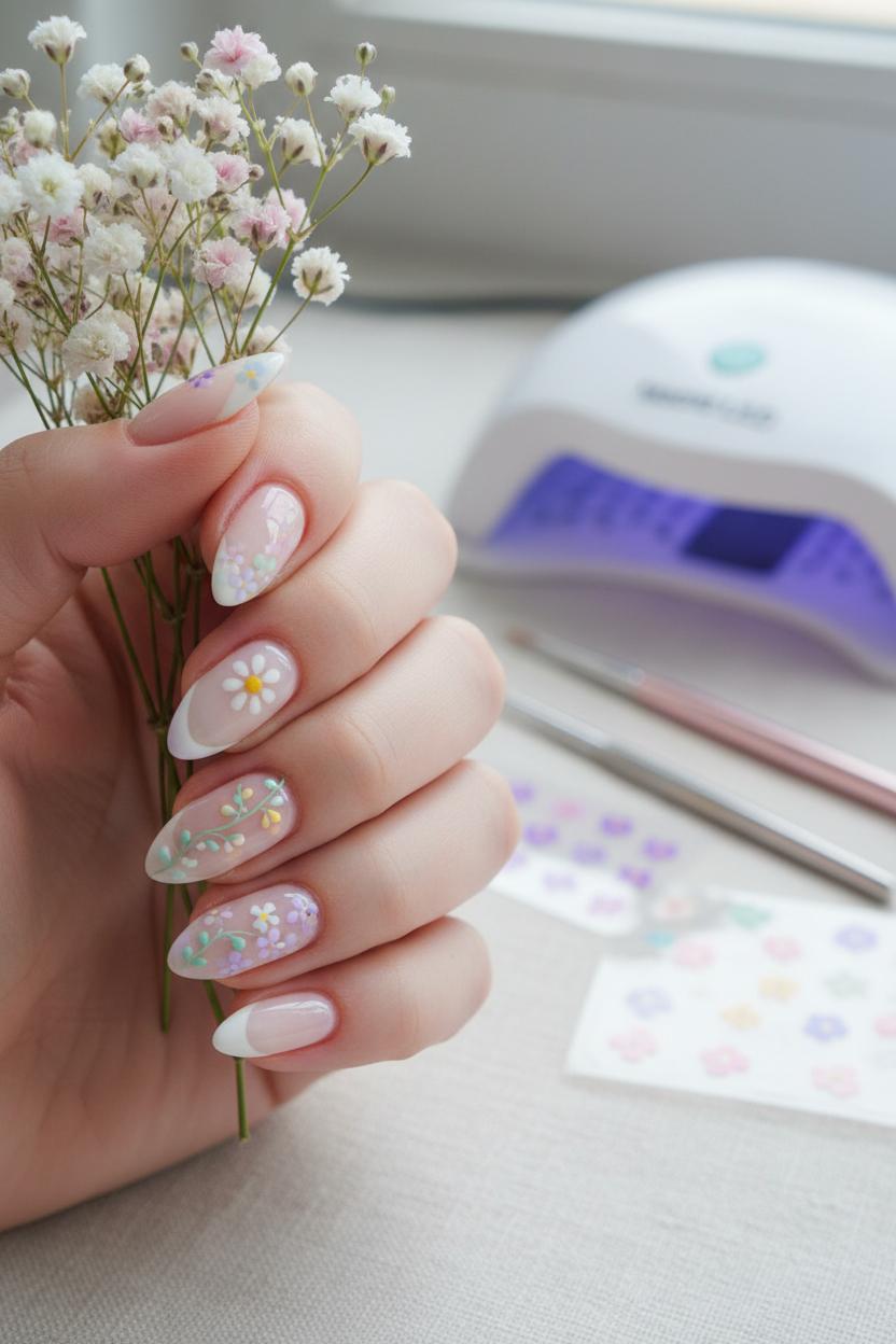 For a polished twist, pair florals with French tips in pastels. Swap stark white for buttercream, pistachio, or lavender, and keep the tip skinny for that minimalist micro-French that lets the art breathe. You can even do gradient tips—ombre just the smile line from peach to pink—then perch one or two tiny blooms on a corner for a chic, editorial finish. Reverse French half-moons in milky rose at the base look gorgeous with scattered micro-daisies, too. Mix a couple of these ideas across your hand for that curated, Pinterest-ready vibe: a gradient here, a micro-floral accent there, and a pastel French to tie it together. With the right tools—detail nail art brushes, dotting tools, and your UV LED nail lamp—you’ll have a soft, blooming set that feels fresh all season.