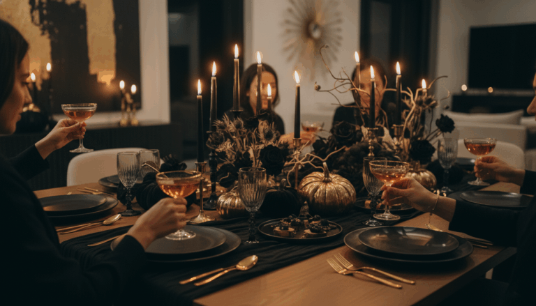 Throw an elegant Halloween party that shimmers with black and gold decor and a touch of gothic glam. In this guide, I’ll show you how to craft a sophisticated Halloween mood with a layered halloween tablescape—think matte black dinnerware, black…