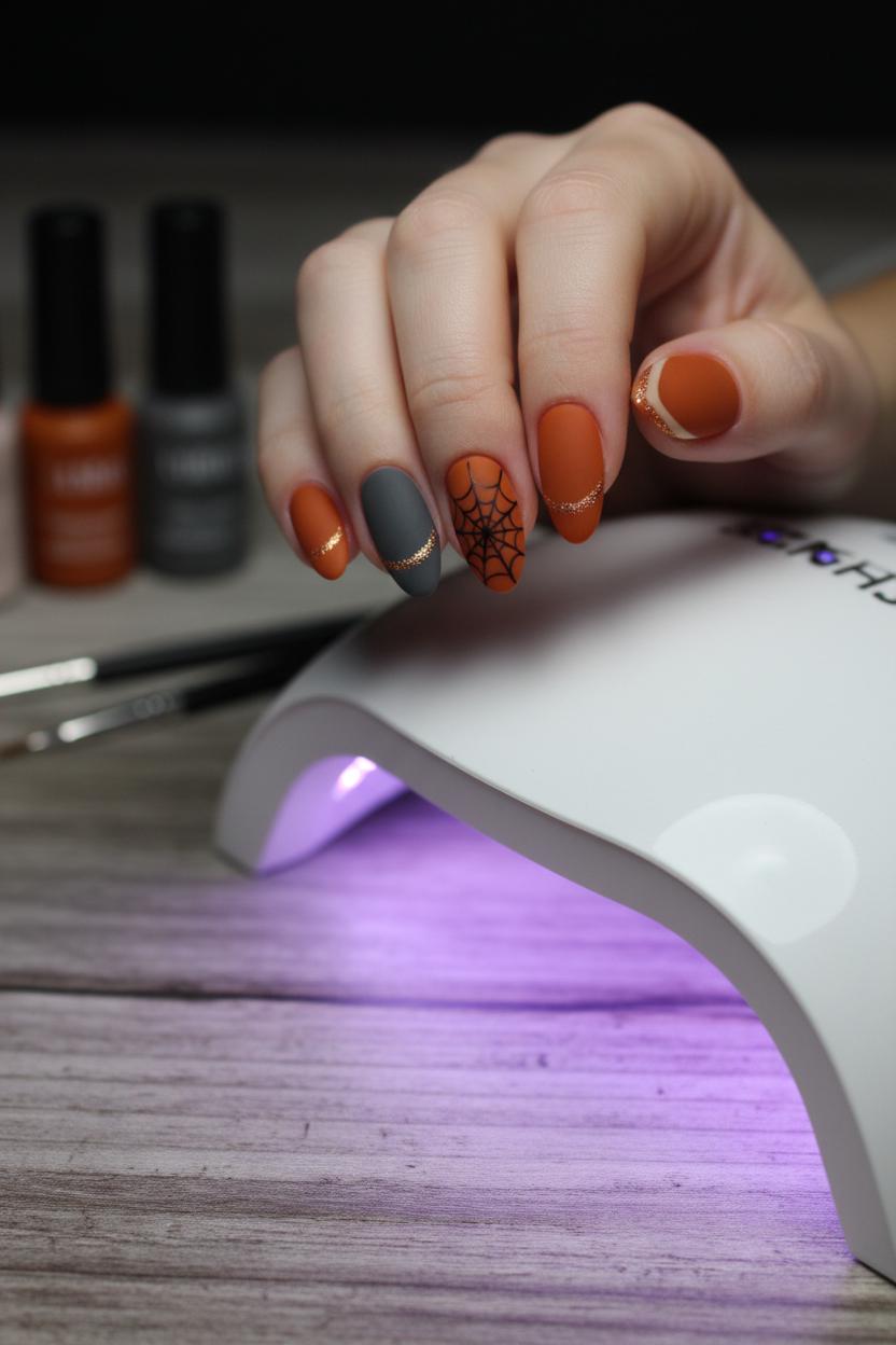 Think of your polish drawer as a little autumn mood board waiting to happen. Start by pulling a few bottles from your gel nail polish set that feel like crisp air and cozy sweaters—burnt orange, inky charcoal, creamy latte, a pop of copper shimmer. For sleek halloween nails with minimal effort, try a “Pumpkin Smoke” story: alternate pumpkin and charcoal on each finger, add a skinny latte micro-French, then tap a whisper of copper at the cuticle for glow. If you’re craving spooky nail designs without going full costume, float a single spiderweb or crescent moon with your nail art brushes on one accent nail and seal it with a matte top coat for that velvety, suede finish. Cure as you go under a UV LED nail lamp and you’ve got a polished, seasonal set that reads chic, not cheesy.