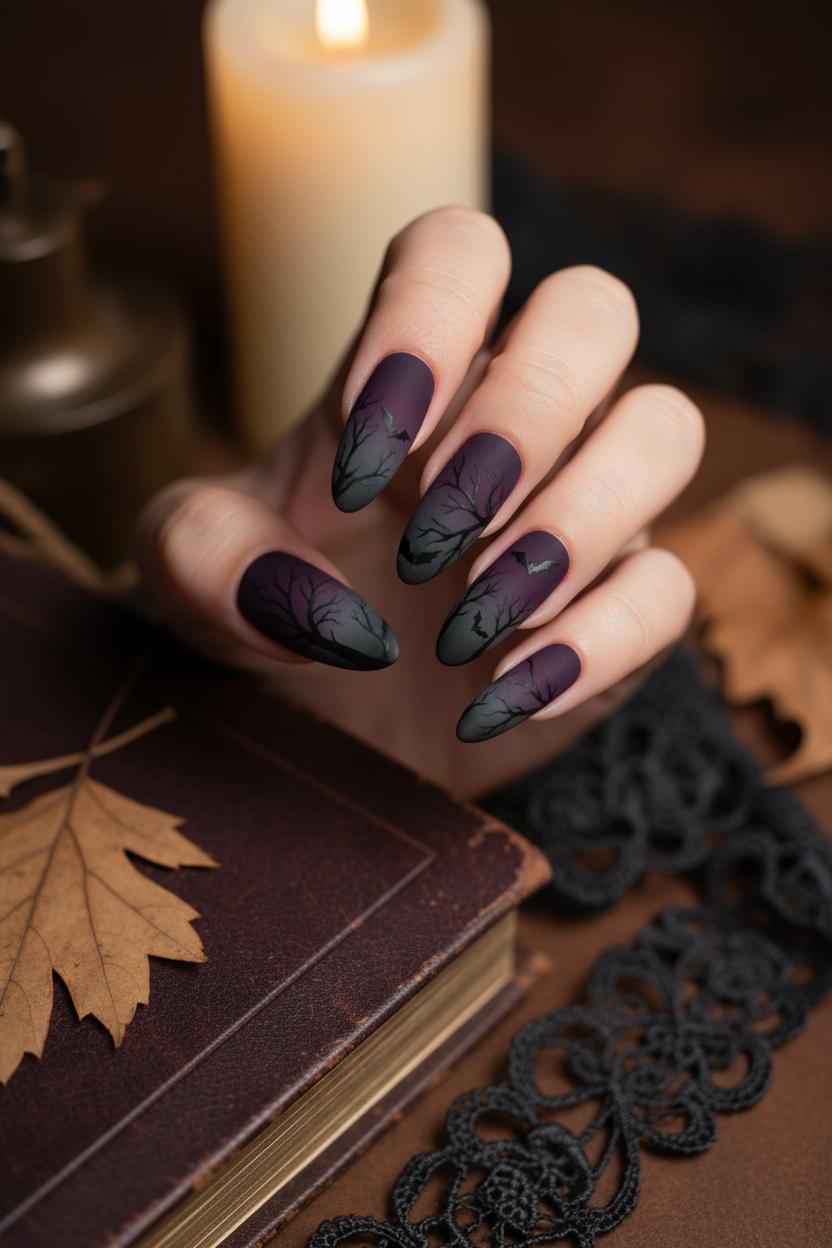 Gloss is the life of the party, but matte is the midnight afterparty—quiet, dramatic, and a little mysterious. When you’re dreaming up moody halloween nails, a matte top coat instantly deepens your palette and softens harsh shine into a velvety, candlelit vibe. Think inky purples that look like twilight, terracotta pumpkins that feel like suede, and charcoal blacks that read as smoke rather than patent leather. Matte finishes blur edges in the best way, which is why they’re perfect for spooky nail designs that lean romantic and haunted rather than cartoony. If your fall manicure mood board says “foggy graveyard, lace, and old spellbooks,” matte is your best friend.