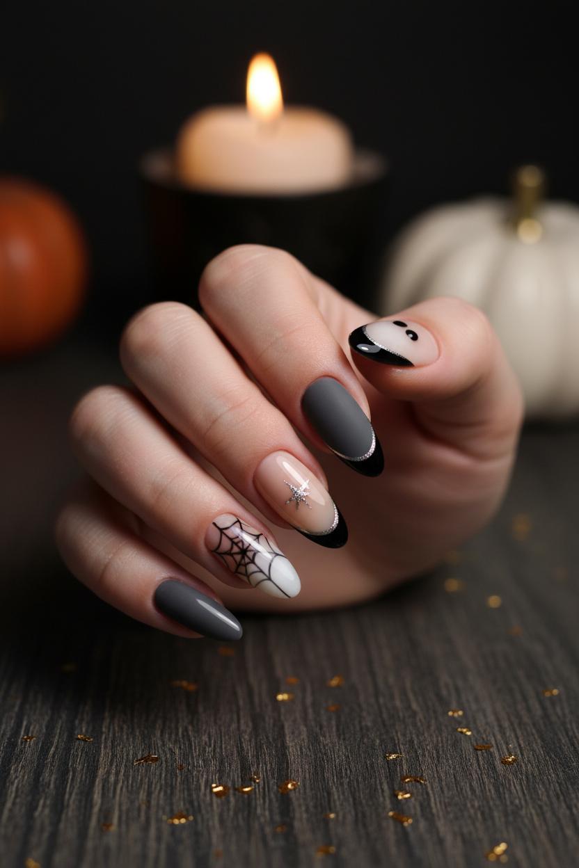 Spooky chic is all about the sweet spot between eerie and elegant—the kind of halloween nails you can wear to the pumpkin patch, a candlelit dinner, and your 9 a.m. meeting without changing a thing. Think moody, minimal, artful details instead of full-costume camp: soft charcoal and creamy latte tones, inky black French tips with whisper-thin silver lines, a single tiny star twinkling on a bare nail. Negative space is your best friend here; it keeps spooky nail designs airy and elevated, letting a slim crescent moon, a delicate web, or the faintest wisp of smoke float over a sheer base. Even ghost nail art gets a glow-up when you paint translucent little phantoms with fine outlines and one dot of bright white for eyes—haunting, not hokey. The finish matters, too. A matte top coat turns blacks velvety and instantly luxe, while a glossy accent on one nail feels like patent leather next to cashmere.
