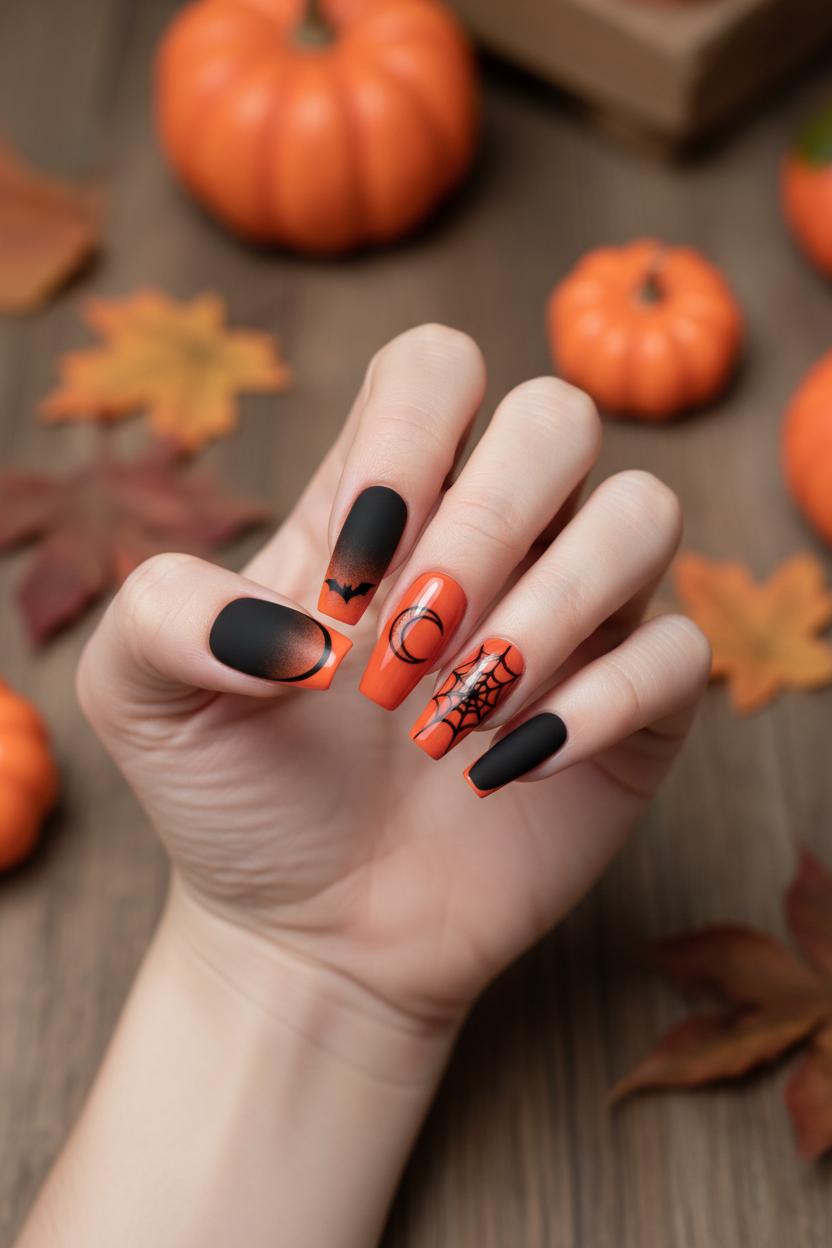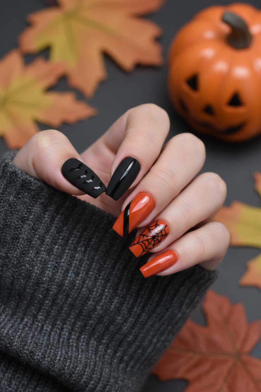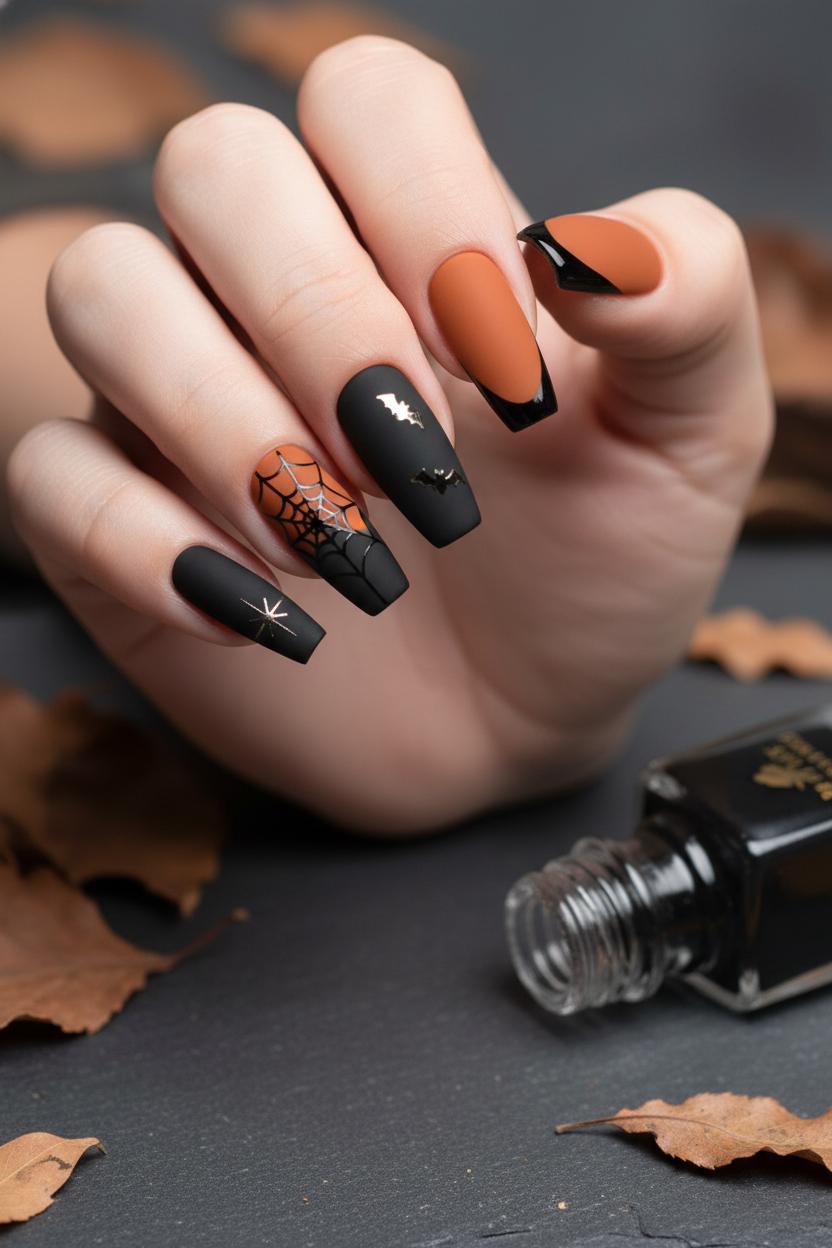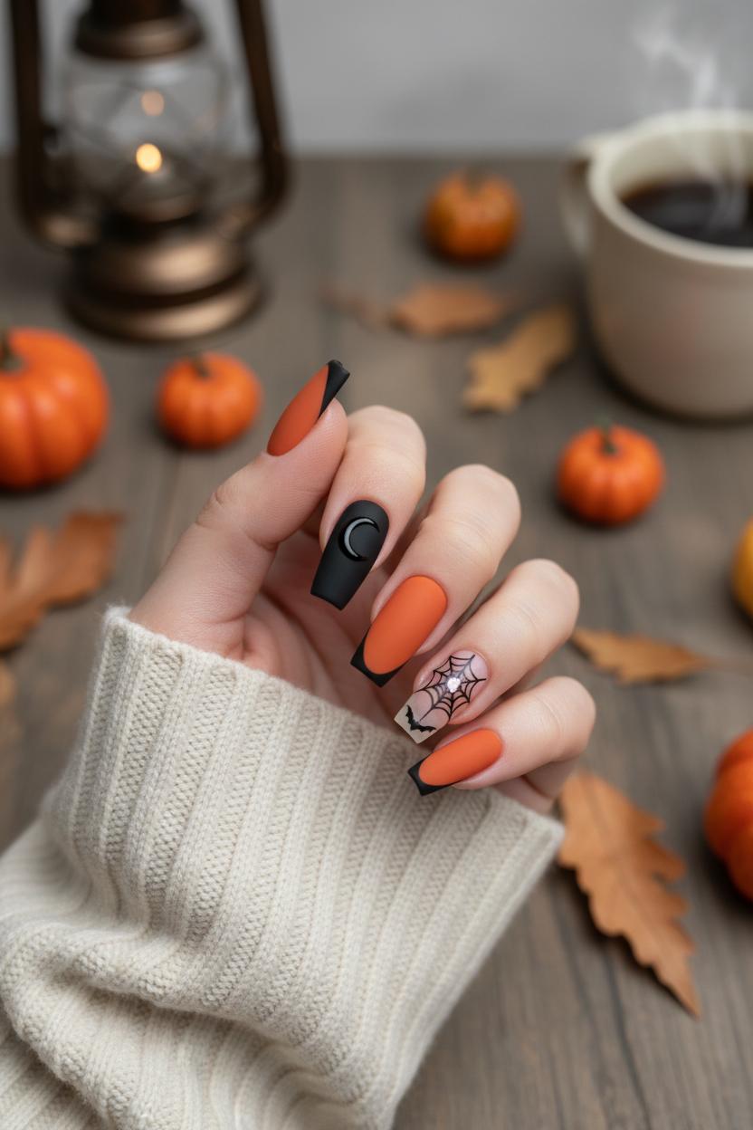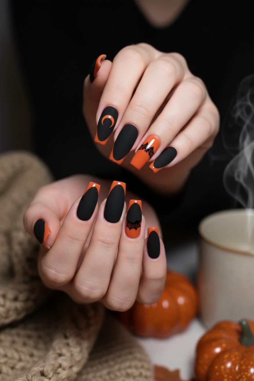 Spooky chic Halloween nails with matte black and pumpkin orange tones — trendy manicure combining bold contrast and festive fall style.