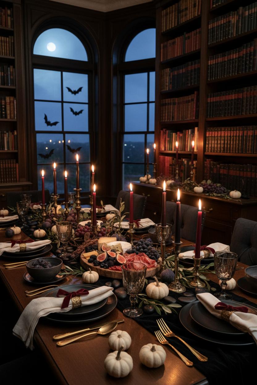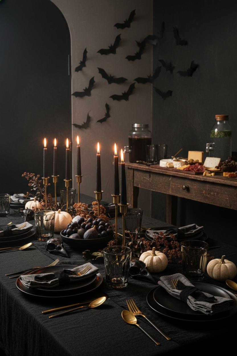 Lighting is everything for this look. Cluster taper candle holders down the center and alternate deep black or wine-colored tapers with soft ivory ones so you get layers of glow instead of a single harsh tone. If you want a playful wink of spooky decor without going kitschy, let a few bat wall decor silhouettes “fly” up from the table to the wall, like the candles have lifted them into motion. Tuck in eucalyptus, olive branches, or foraged clippings for moody greens, then add figs, plums, or damson grapes for dusky purples that tie the whole palette together. A generous cheese board set piled with dark berries, honeycomb, and charcuterie becomes both centerpiece and snack—earthy, elegant, and so on-theme.
