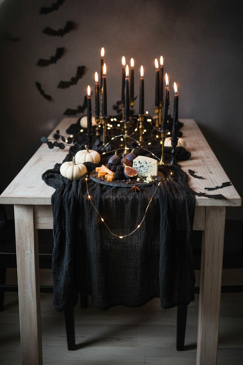 Once the black table runner is down, layer along that spine. Cluster taper candle holders in staggered heights so the flames dance at different levels—matte black for drama, antique brass for warmth—and nestle them into the folds. Tuck in mini white pumpkins to break up the darkness with creamy highlights, and weave a thin strand of twinkle lights through for a soft, ember-like glow. A cheese board set placed right on the runner earns its spotlight; the ebony backdrop makes figs, dark berries, and sharp cheeses look extra decadent. For playful movement, let a trail of bat wall decor flutter up from the end of the table to the wall behind—such an easy way to connect the tablescape to the room without overwhelming your halloween party setup. Keep a few dried stems, black taper drips, and scattered cloves or star anise along the runner for subtle texture and scent.