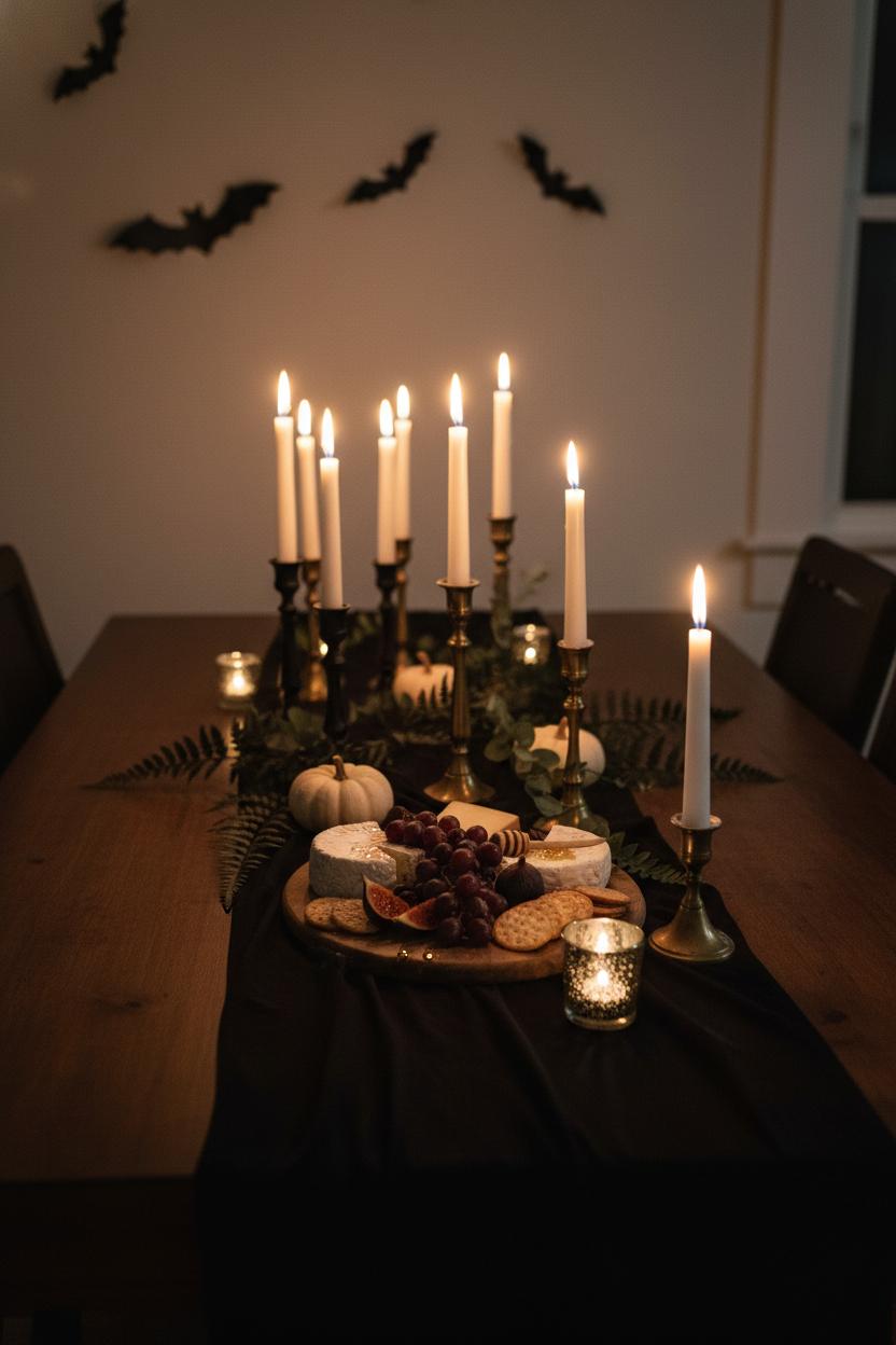 For styling, think rhythm and texture. Start tall at the center, step down in height toward the ends, and weave in a couple of low mercury glass votives to catch and amplify the flame. If food is part of your plan (it always is for me), keep scents minimal and let a beautiful cheese board set double as a focal point—rustic crackers, dark grapes, figs, and a drizzle of honey glisten under the candlelight like tiny jewels. The contrast of creamy cheeses beside the inky runner is so photogenic. Add a few sprigs of eucalyptus or dried ferns to bridge the line between fall party ideas and full-on gothic romance. For safety and polish, secure taper candle holders with a dot of museum putty, trim wicks before guests arrive, and give yourself five minutes before the doorbell rings to turn off overhead lights so the glow does the talking. With these simple layers, your halloween tablescape becomes a warm, cinematic scene—equal parts cozy and captivating—proving that the right candles are the most hardworking piece of spooky decor you can own.