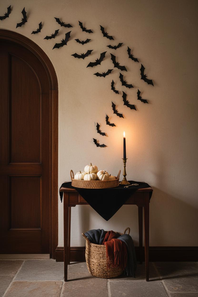 Once your halloween tablescape is set, let the mood spill into the rest of the room so guests feel wrapped in the atmosphere from the moment they walk in. Start with the walls: a flutter of bat wall decor arcing over a mirror or doorway instantly carries the eye beyond the centerpiece and makes the whole space feel enchanted. Repurpose what you already have—drape a black table runner across a console or mantel for a soft, shadowy foundation, then layer in taper candle holders of different heights to cast that cinematic glow. Tuck mini white pumpkins along book stacks and window sills like tiny moons, and weave in a few dried branches or dark florals to echo the cozy, gothic party mood without going overboard on props. This is the sweet spot between warm fall textures and spooky decor: subtle, layered, and a little mysterious.