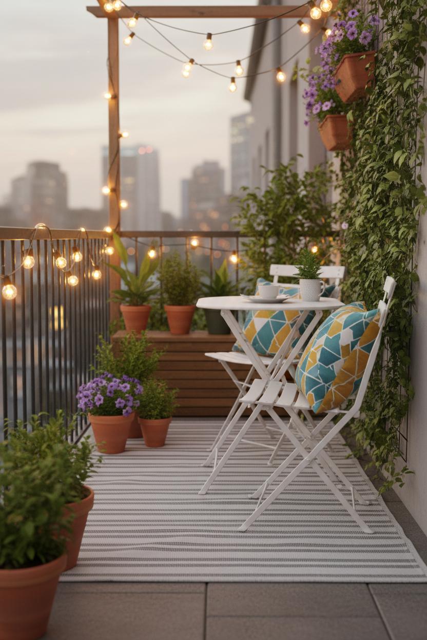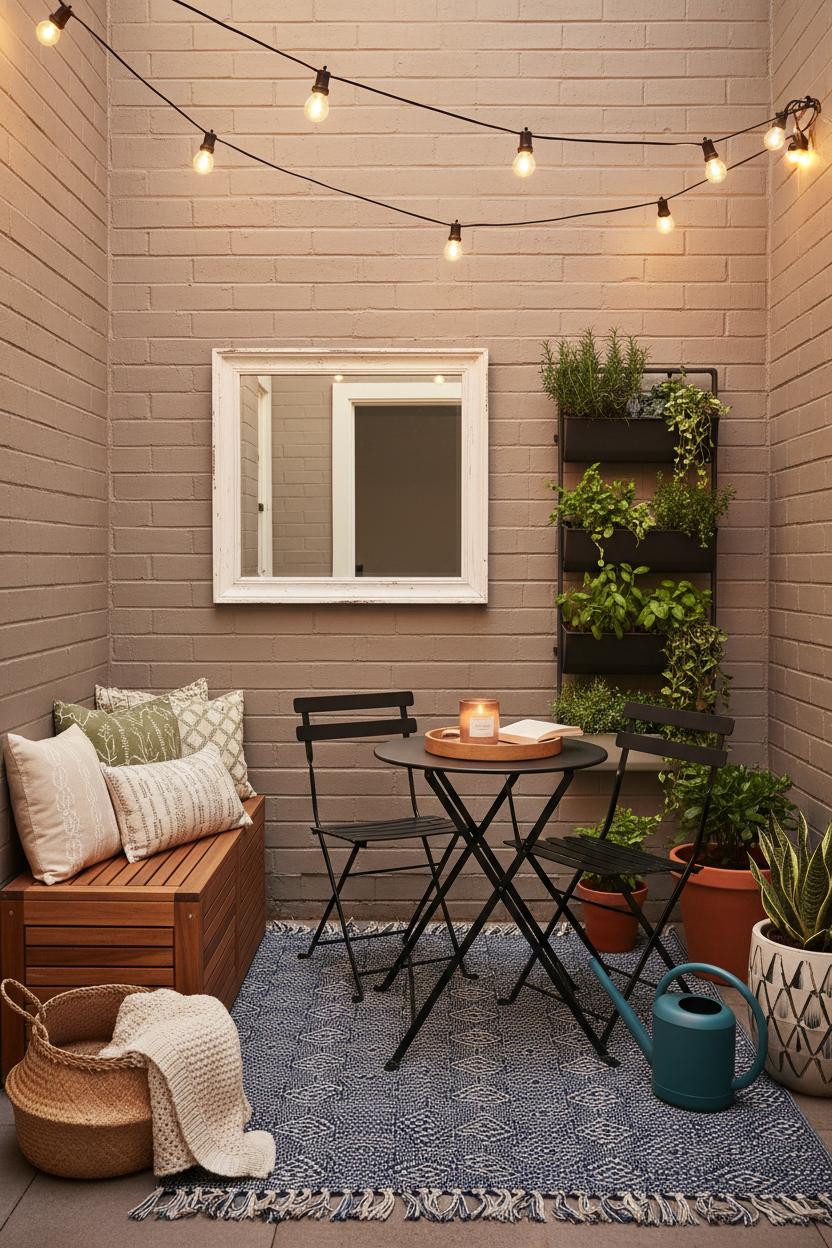 Next, create a cozy landing zone with a folding bistro set—lightweight, slim, and perfect for coffee-at-sunrise or a glass of wine under the stars. Pull it slightly off-center so the space feels styled, not staged, and add a small tray for a candle and your favorite read. These small patio ideas shine on balconies, too; think of them as smart balcony decor that can be folded and stashed when you need room to stretch. String outdoor string lights in gentle swoops overhead or along a railing to bathe everything in a warm glow—suddenly your everyday stoop transforms into a little outdoor oasis. If you have a wall or fence, hang a mirror to bounce light and make things feel bigger, then soften edges with trailing plants.