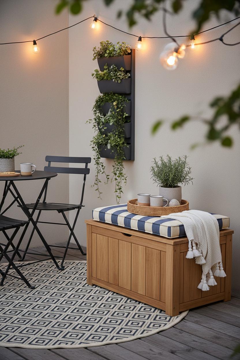 Greenery brings instant life without constant fuss if you choose it wisely. A vertical planter along a wall or railing saves square footage while giving herbs and trailing vines a place to climb; bonus points for self-watering inserts that keep everything happy through hot spells. Mix a couple of hardy evergreens with drought-tolerant favorites like rosemary or sedum to keep the scene lush year-round. When storage is scarce in a tiny outdoor space, a compact storage bench becomes your secret weapon—stash cushions, citronella, and garden tools inside, then use the top as extra seating or a plant perch. These multipurpose pieces make balcony decor feel thoughtful and tidy, not crowded.