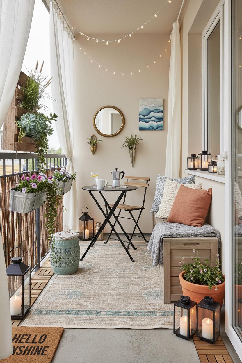 If your balcony is more latte perch than lounge, you can still create balcony decor that feels thoughtful and luxe without overspending. Start by defining the “room” the way you would indoors: an outdoor rug instantly pulls the zone together and softens concrete underfoot. Keep furniture light and foldable so every inch works hard; a petite folding bistro set tucks away between morning coffee and weekend-apéro duty, while a compact storage bench doubles as seating and a spot to stash cushions or a watering can. Choose a tight color palette—think sunwashed neutrals with one accent hue—so even a tiny outdoor space looks cohesive rather than crowded. Layer in pillows with varied textures, a cozy throw for breezy nights, and a low tray to corral candles and glasses.